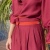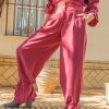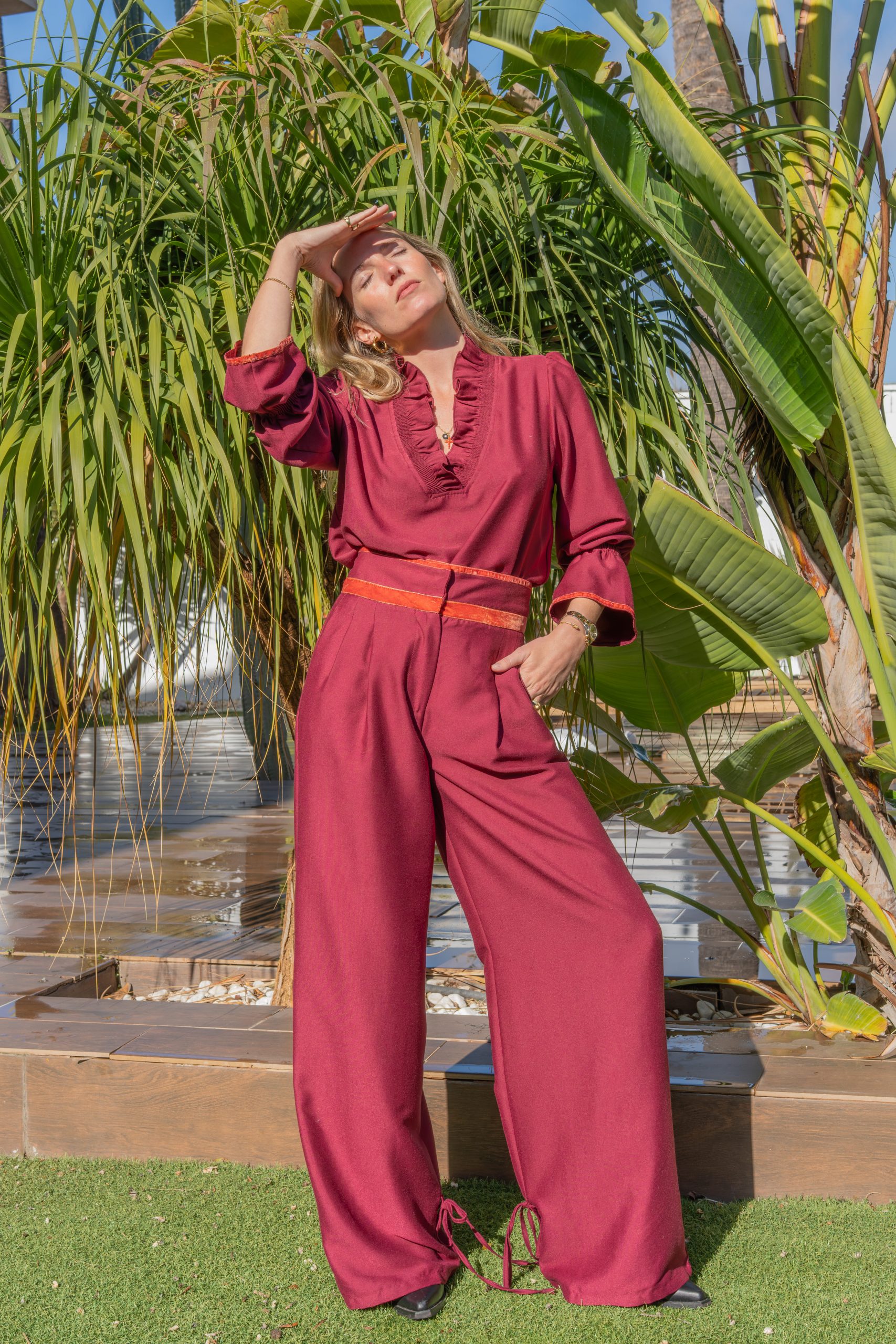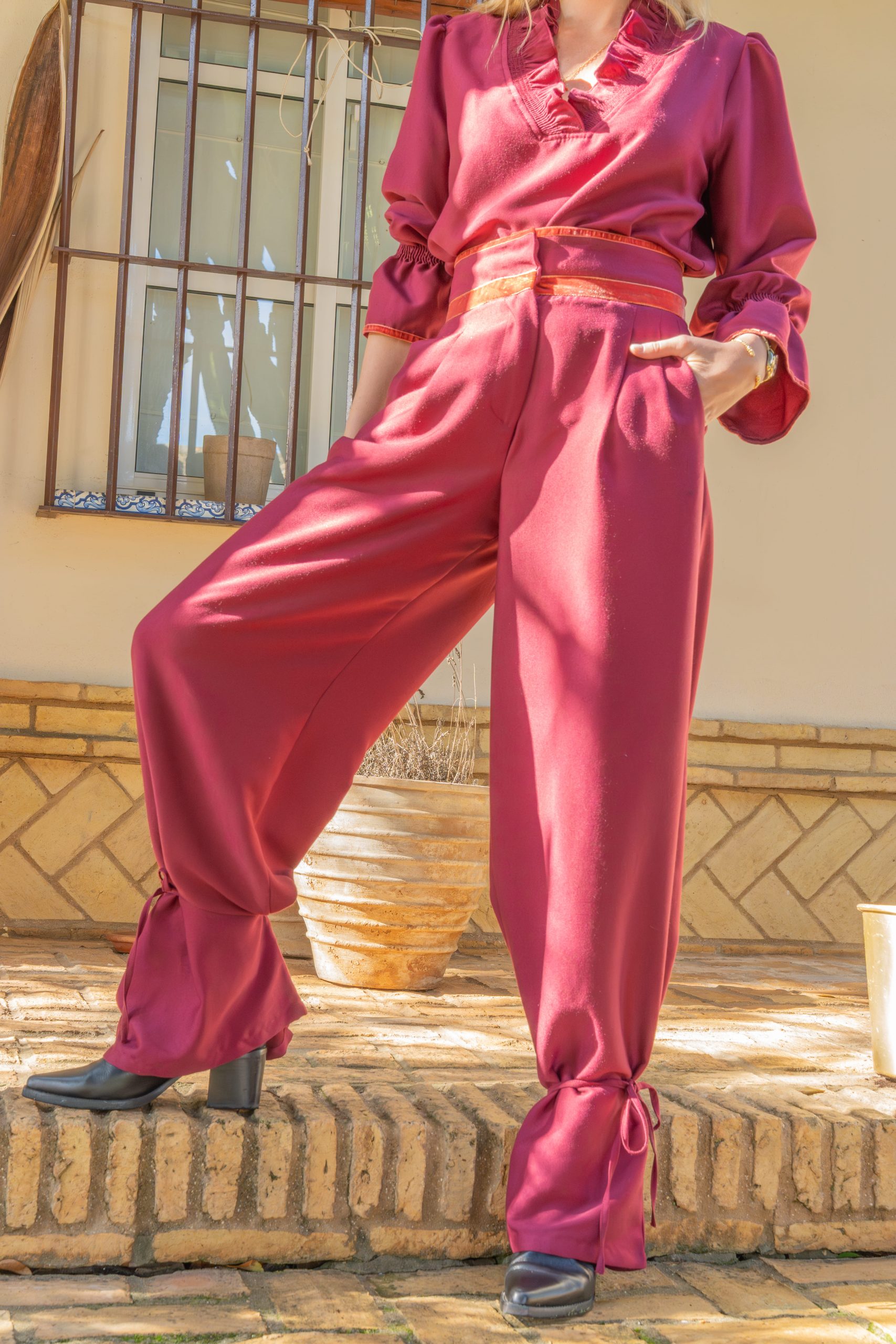 Pantalón de pinza de corte amplio, con tiro medio-alto y cinturilla ancha que realza la silueta. Incluye cuatro botones interiores para sujetar tirantes y convertirlo en peto. En el bajo incorpora lazos ajustables que permiten ceñir el pantalón y transformarlo en un estilo bombacho.