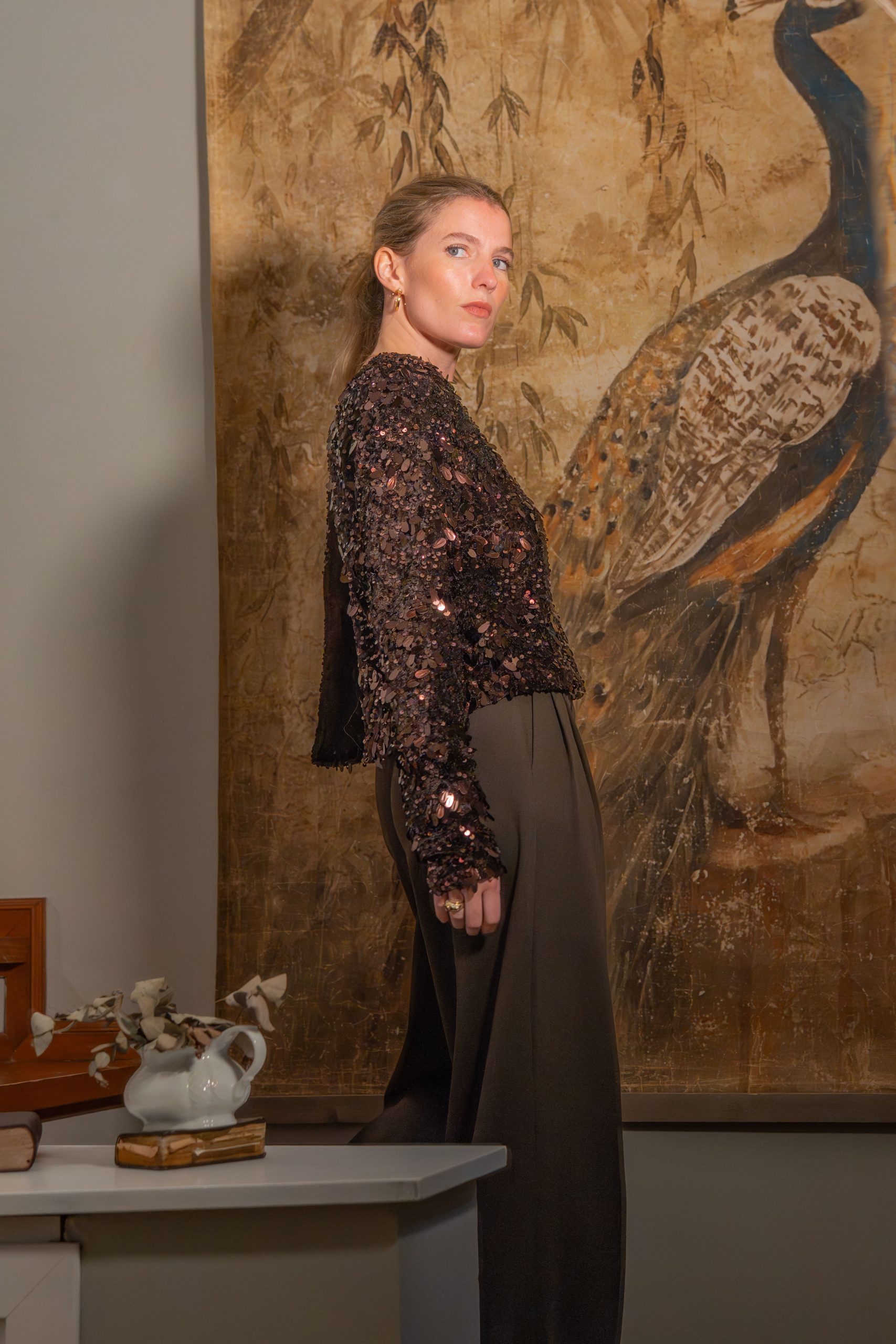 Pantalón de pinza de corte amplio con tiro medio-alto y cinturilla ancha que se adapta perfectamente a la silueta. Diseñado con cuatro botones interiores que permiten ajustar tirantes y convertirlo en peto, aportando versatilidad y un estilo único.