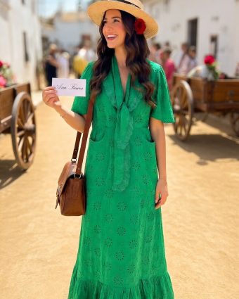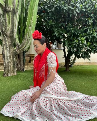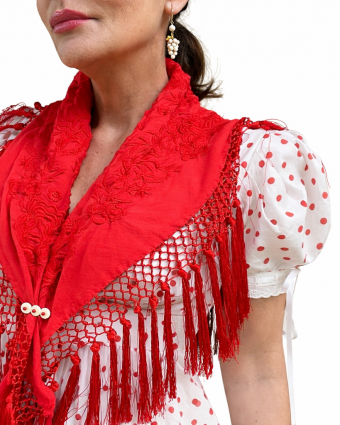 Bata rociera de algodón transpirable. Diseño cómodo con manga abullonada y encaje artesanal. Perfecta para el camino del Rocío. ¡Compra la tuya en Ana Faura!”