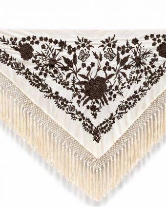 Mantón flamenco triangular crema bordado chocolate mariposas