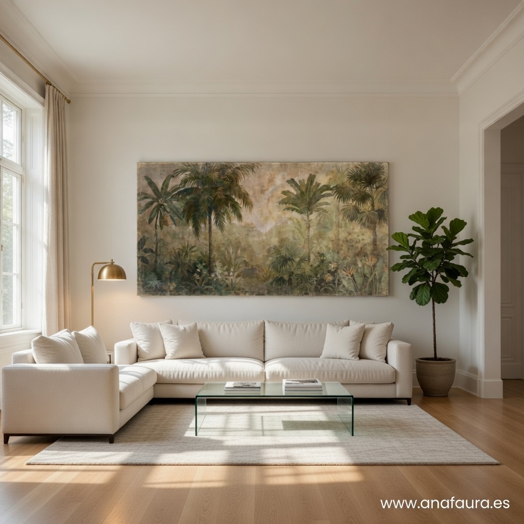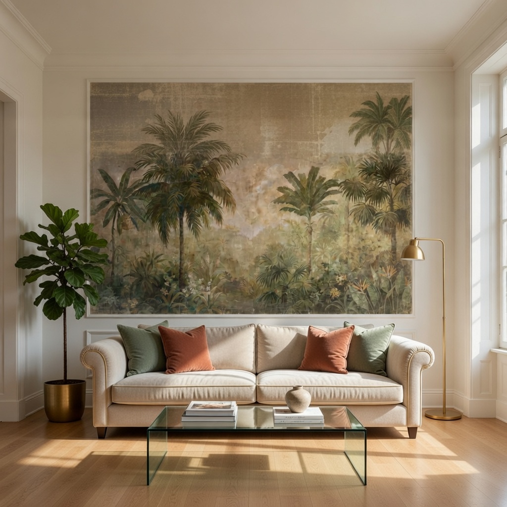 Diseño Evocador: El motivo Aurore Palmeraie utiliza tonalidades suaves y pinceladas etéreas que encajan a la perfección en salones, dormitorios o rincones de lectura de estilo mediterráneo, nórdico o wabi-sabi.