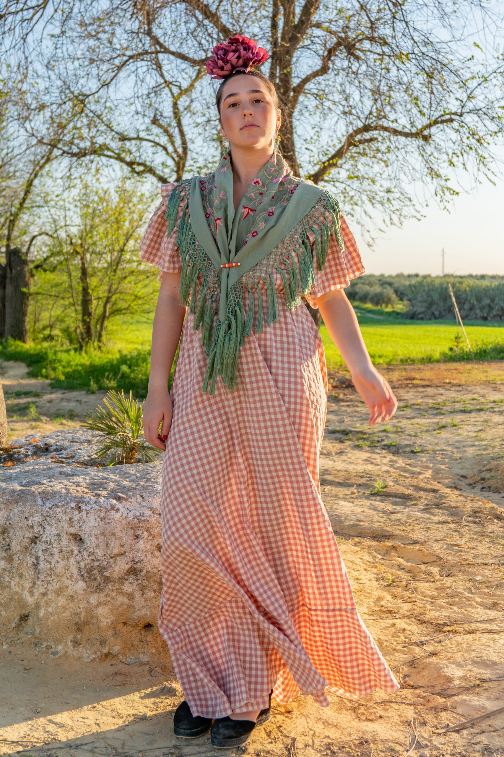 4. ¿Es este conjunto adecuado para el camino de la Romería del Rocío? ¡Sí, absolutamente! La Bata Faura Vichy Rosa está diseñada en algodón premium ligero, ideal para el calor del camino. El piquillo y la flor completan el look tradicional indispensable para cualquier rociera.