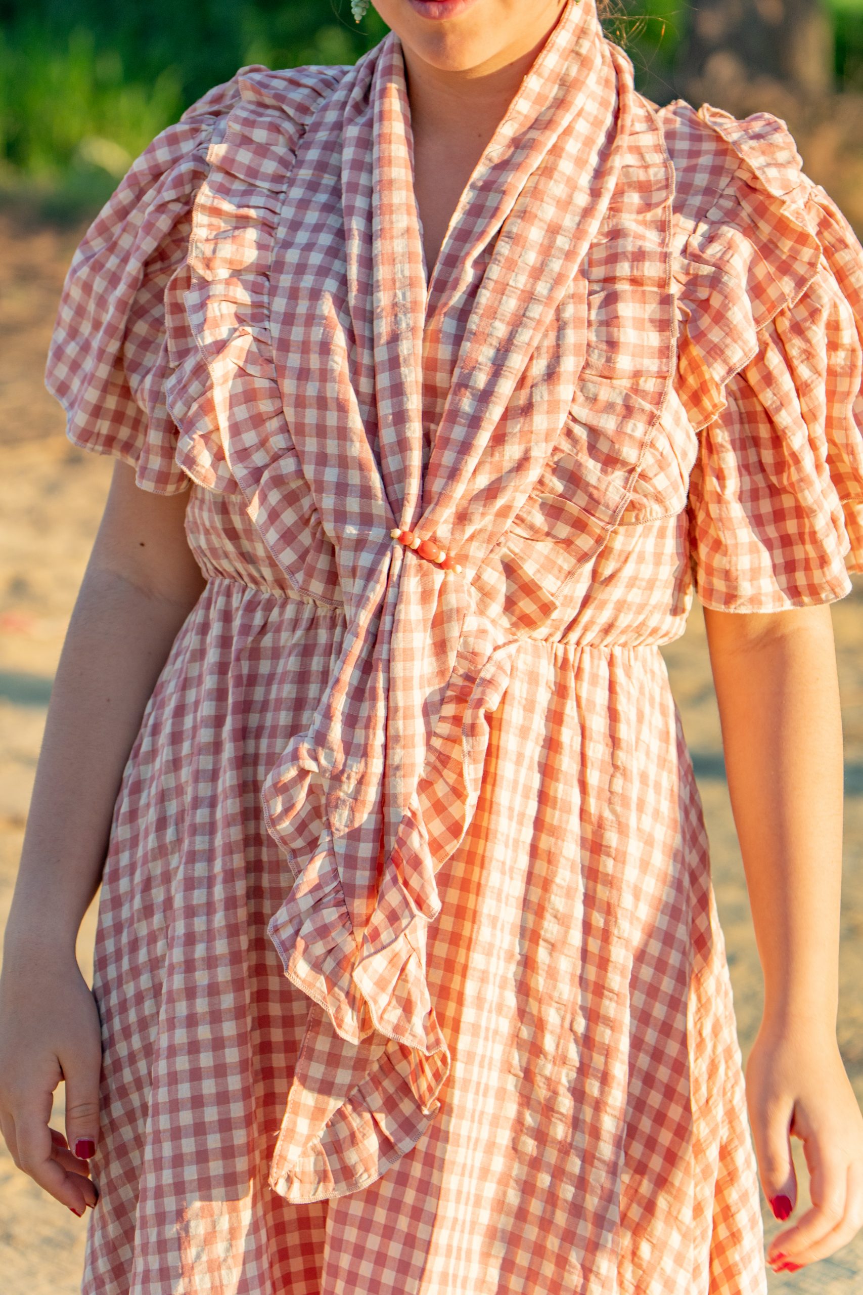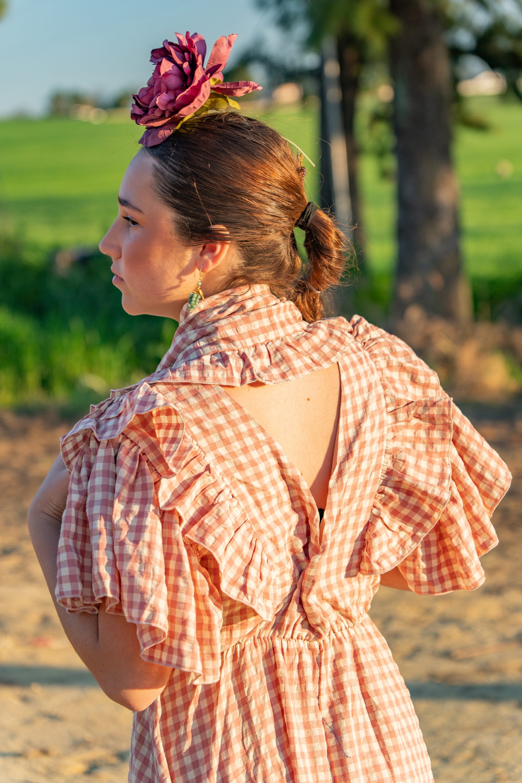 El tono rosa maquillaje (o salmón suave) aporta una luminosidad especial al rostro, especialmente bajo la luz del sol andaluz. Sus mangas de mariposa con volantes y el escote adornado con lazada la convierten en la opción más romántica y cómoda de la temporada.