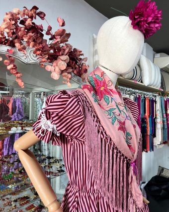 Piquillo a Juego (INCLUIDO): Un pañuelo exclusivo, hecho a mano artesanalmente con el mismo tejido de cuadros vichy rosa empolvado que la bata. Es el complemento tradicional indispensable para las romerías, perfecto para anudarlo al cuello o a la cintura, aportando un toque de distinción y practicidad coordinada.