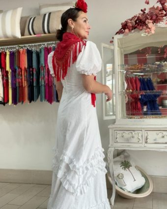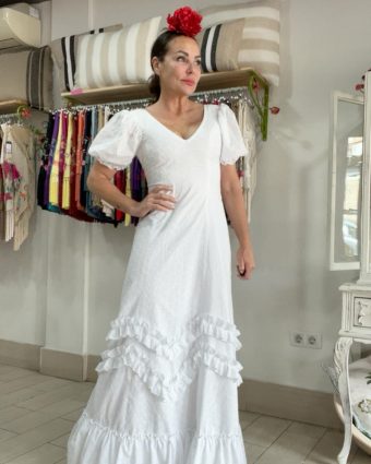 Tejido y Textura: Elaborada íntegramente en algodón de alta calidad con calados de bordado suizo. Este tejido no solo es visualmente romántico y delicado, sino que ofrece una transpirabilidad máxima, fundamental para las jornadas bajo el sol en El Rocío o cualquier romería estival.