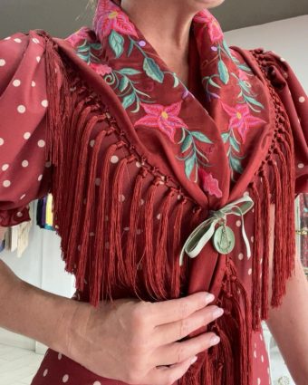 Piquillo a Juego (INCLUIDO): Un pañuelo exclusivo, hecho a mano con el mismo tejido y bordado suizo que la bata. Es el complemento tradicional indispensable para las romerías, perfecto para anudarlo al cuello o a la cintura, aportando un toque de distinción y practicidad coordinada.