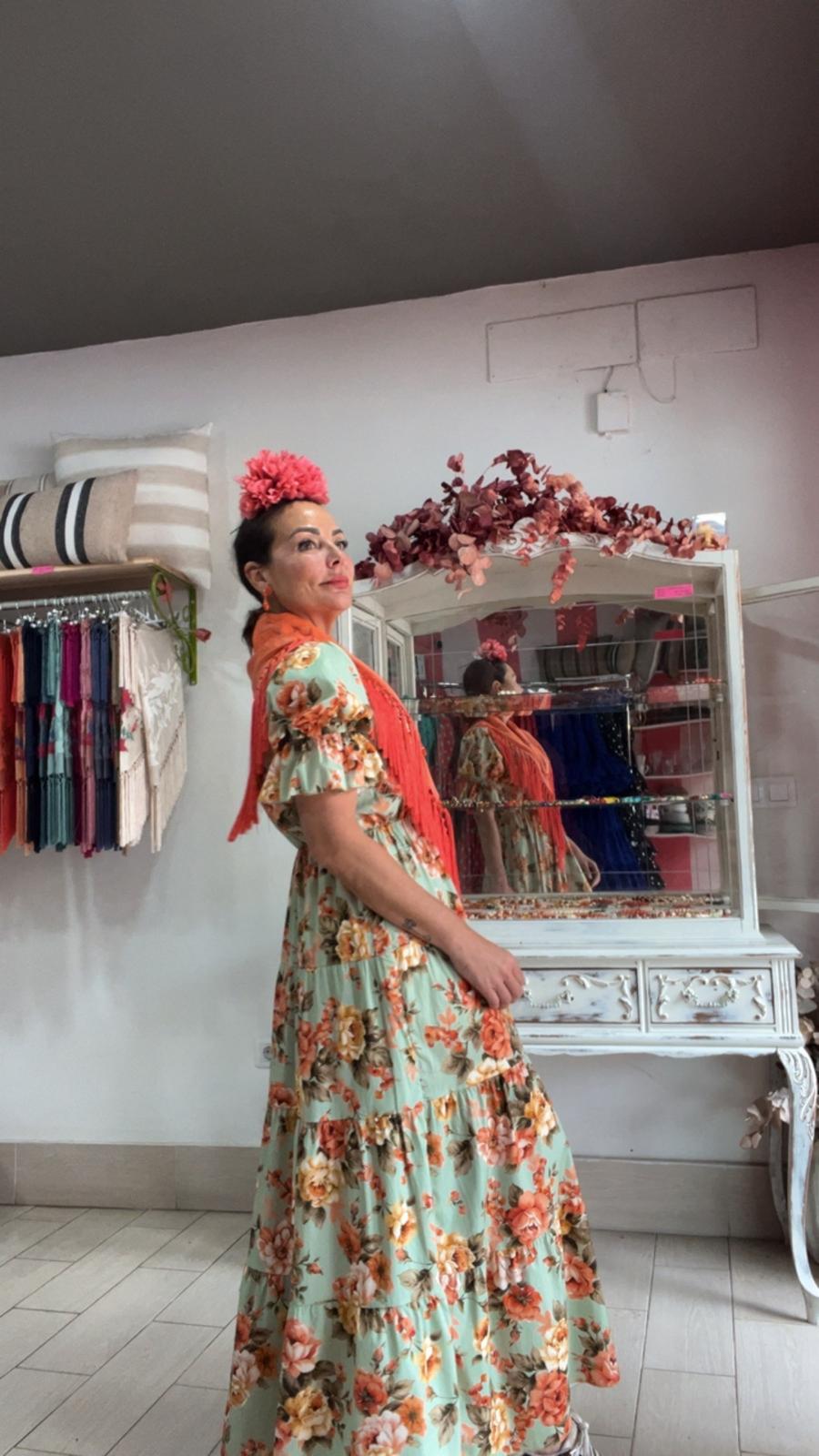 Prepárate para vivir la Romería del Rocío con la Bata Faura Floral Verde Menta, una prenda diseñada para ofrecerte el máximo confort sin renunciar a la estética más cuidada. Su estampado de rosas, símbolo de la primavera andaluza, y su tejido de algodón ligero la convierten en una opción fresca, transpirable y muy favorecedora para las largas jornadas bajo el sol.