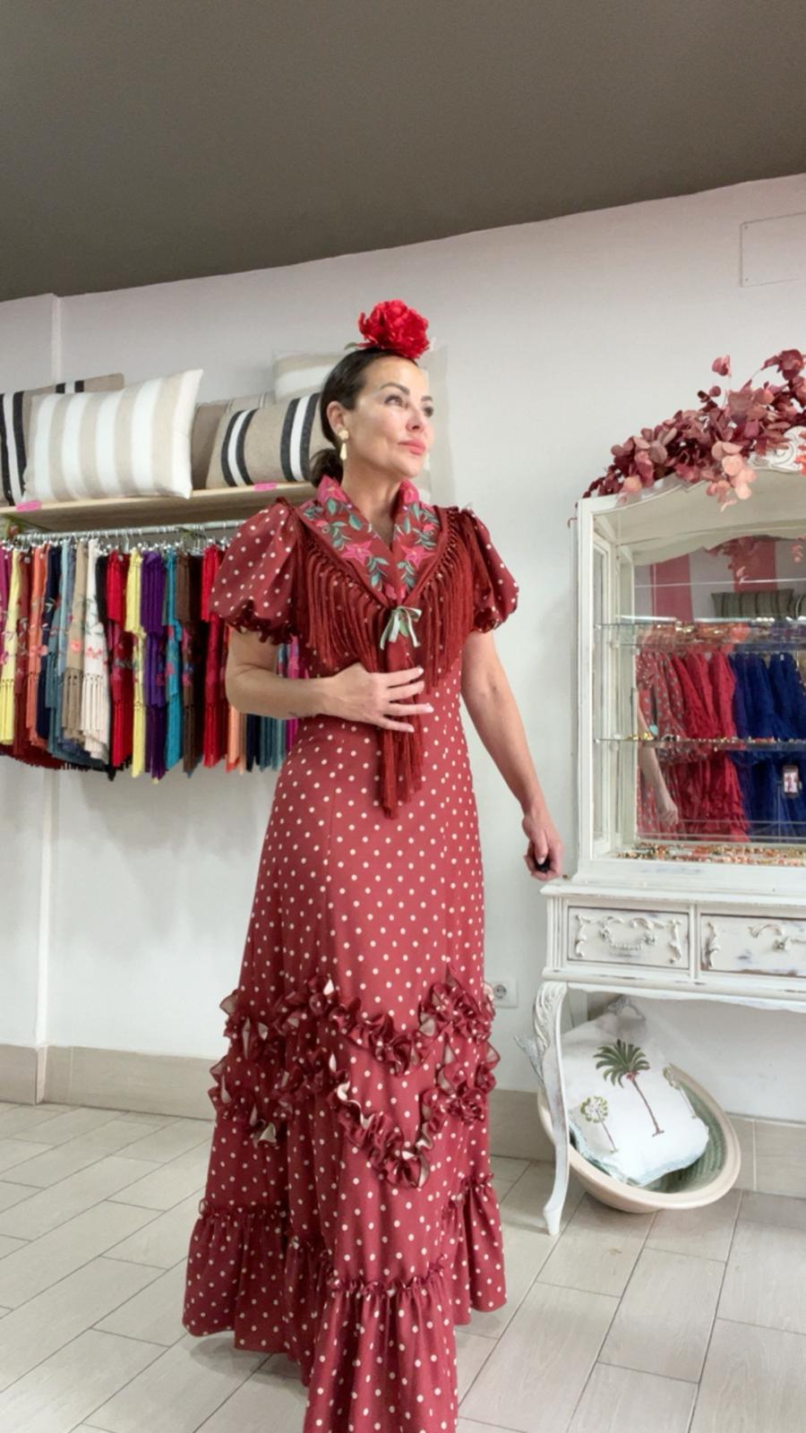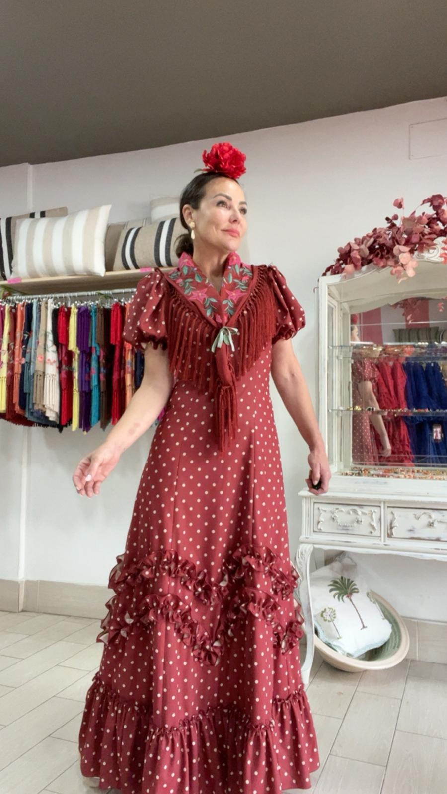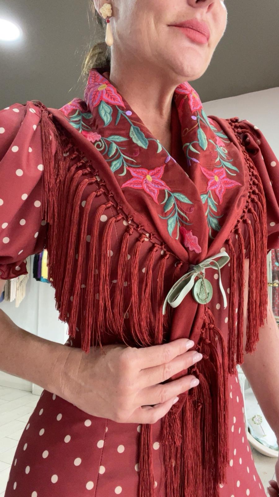 ¿Qué accesorios le van mejor a este tono marrón? Es un color “mágico” para los accesorios. Como ves en las fotos, un mantoncillo en tonos caldera, granate o incluso verdes secos realza muchísimo la pieza. Al ser marrón tierra, acepta flores y pendientes en casi cualquier gama cromática cálida.