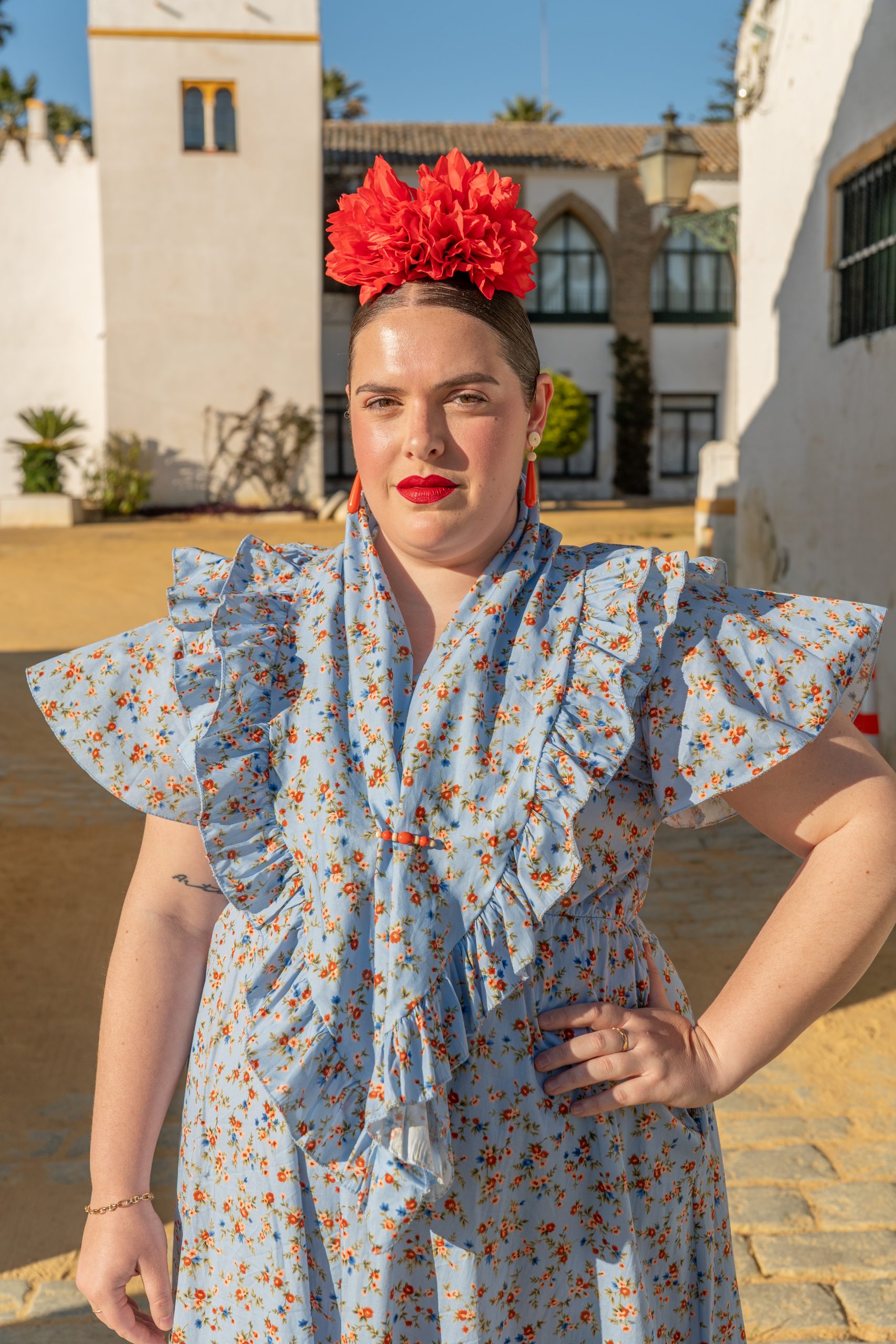 3. ¿El tejido es pesado para caminar bajo el sol? Para nada. Hemos seleccionado un tejido liviano y con mucho movimiento, ideal para las temperaturas del Rocío y las romerías. Es fresco y, gracias a su estampado Liberty, disimula muy bien el polvo del camino.
