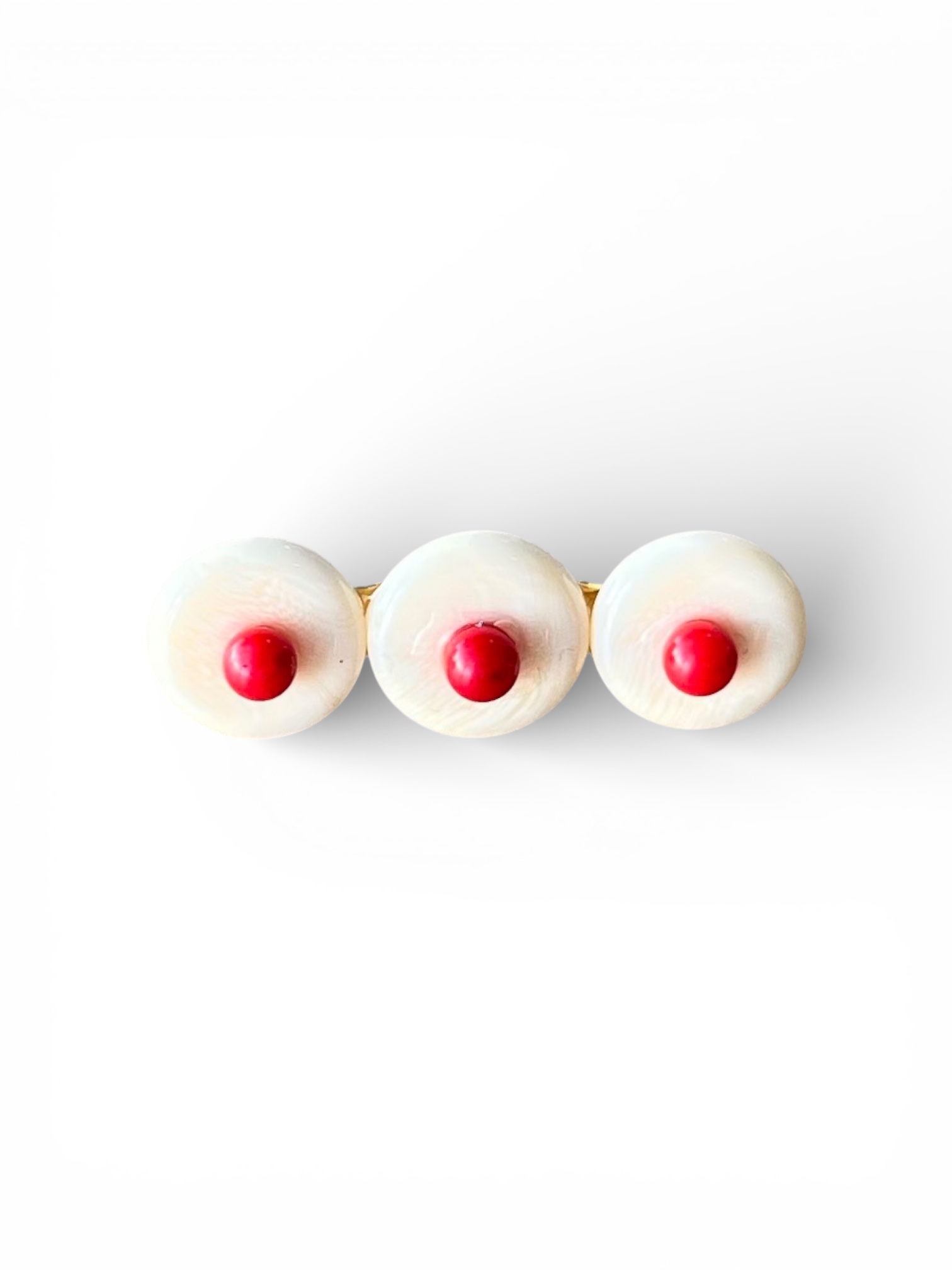 Broche flamenco de inspiración tradicional con diseño tipo lunar en tono hueso y detalle central en rojo.