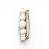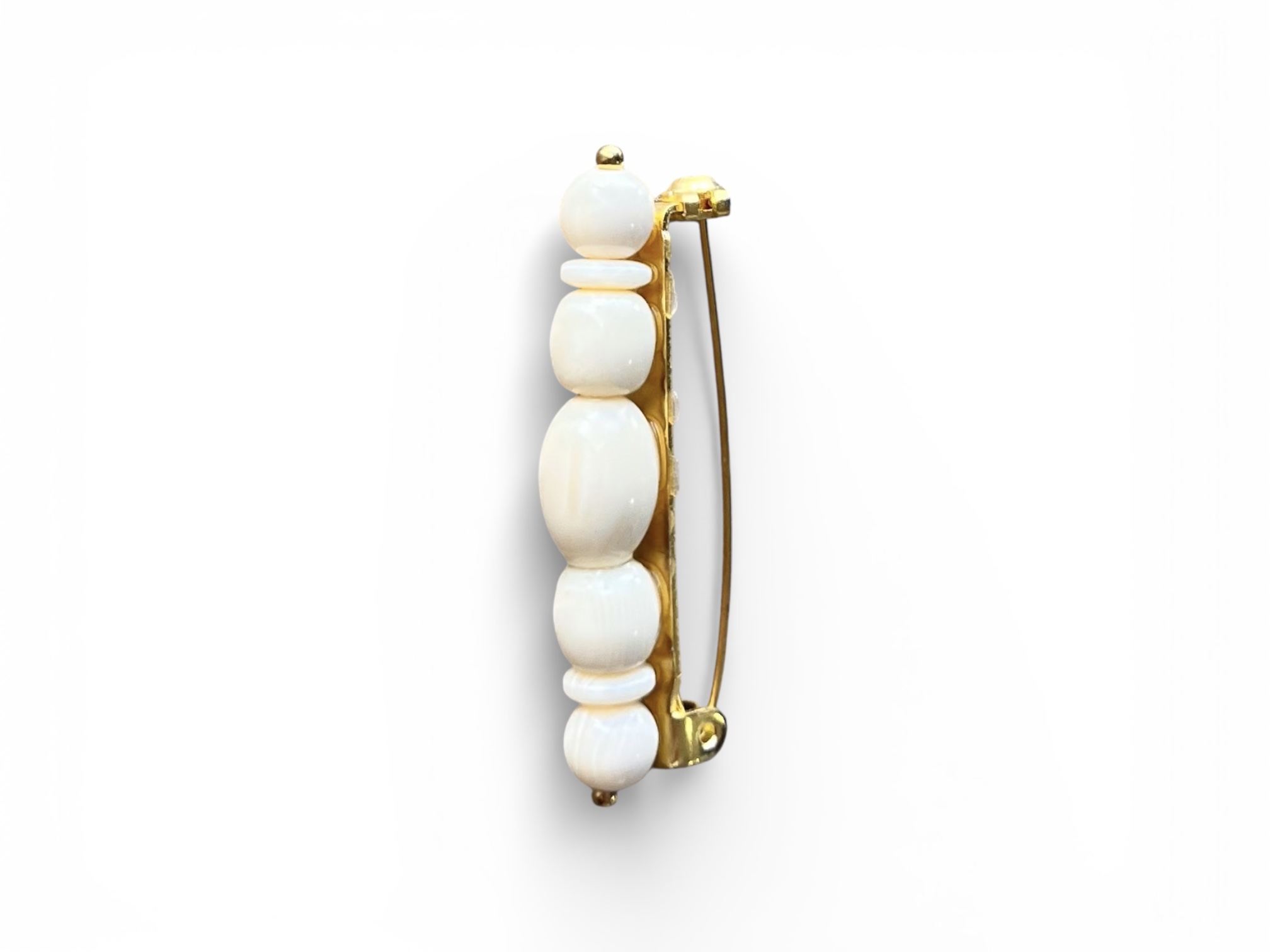 Diseñado de forma artesanal con cuentas de acabado pulido y montado sobre base metálica en tono dorado, aporta ese detalle especial que realza el traje sin recargarlo.