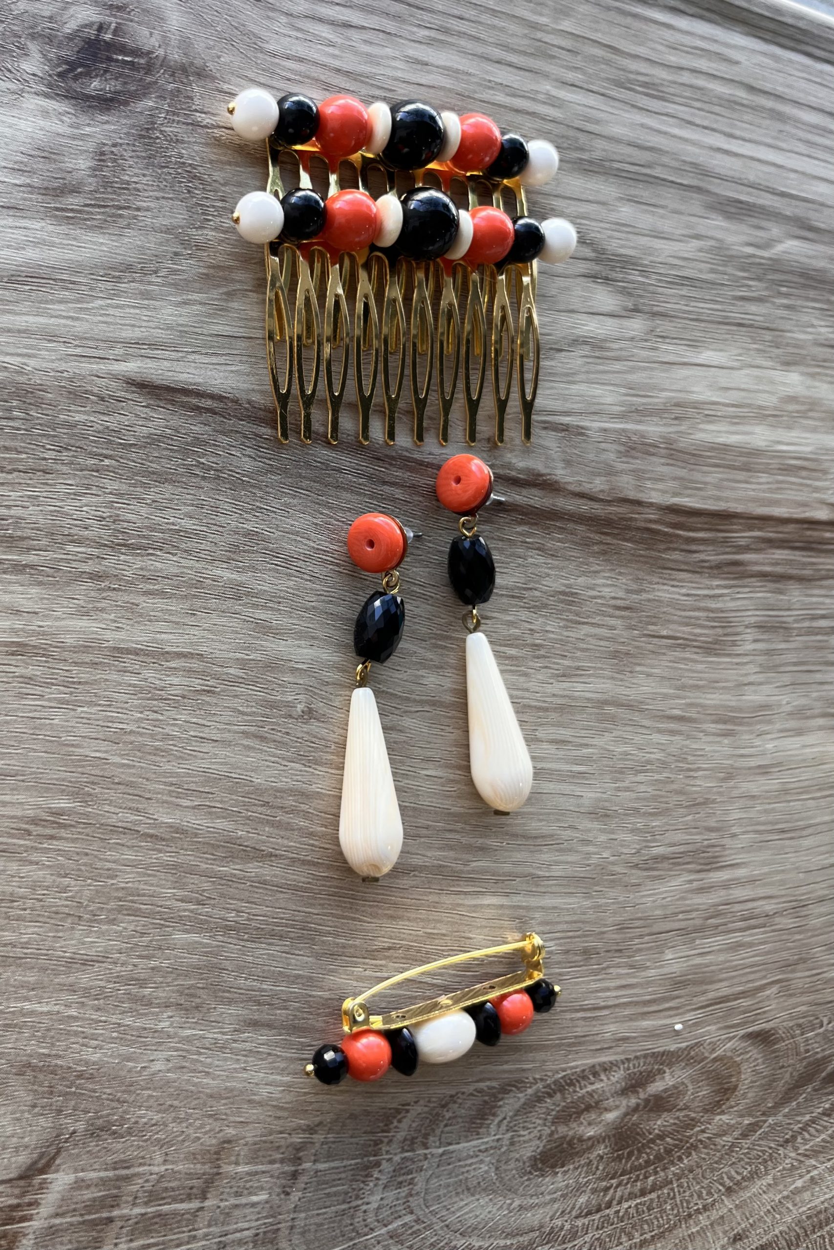 Conjunto flamenco artesanal compuesto por peina flamenca, pendientes flamencos y broche, elaborado a mano cuidando cada detalle para conseguir un acabado único y especial.