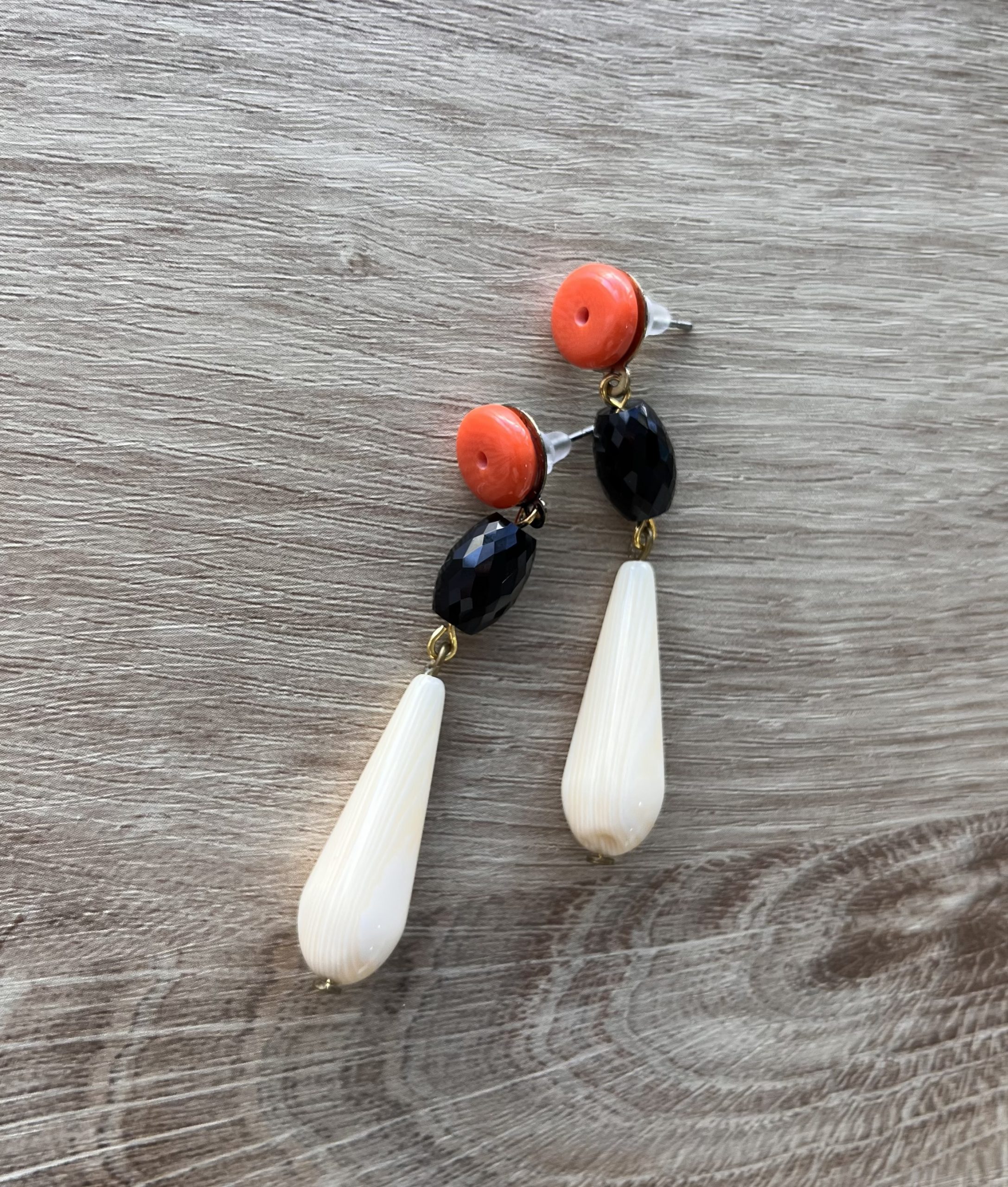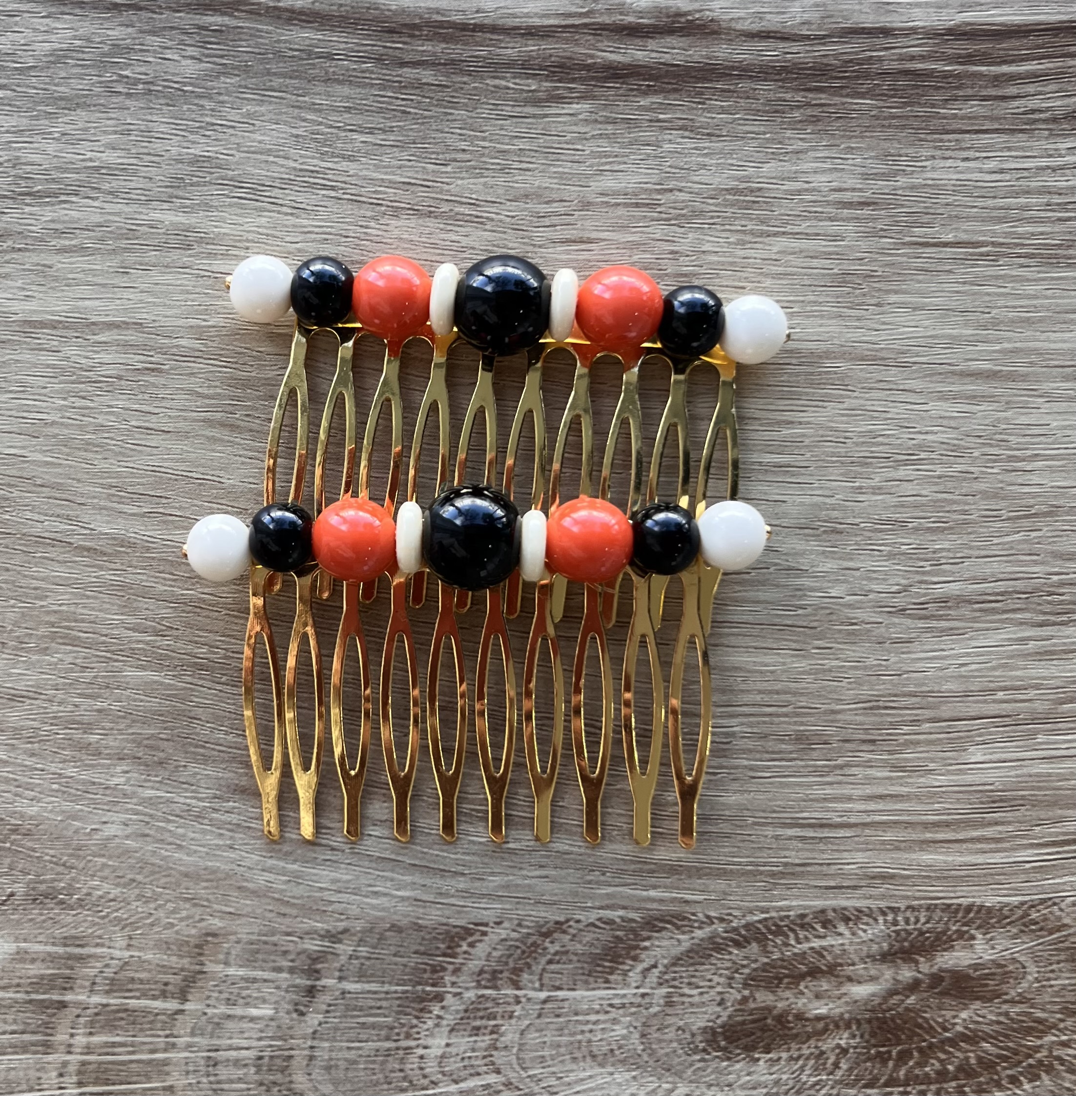 Su diseño combina cuentas en tono coral, negro y hueso, una combinación clásica y muy favorecedora que aporta fuerza, contraste y elegancia al conjunto.