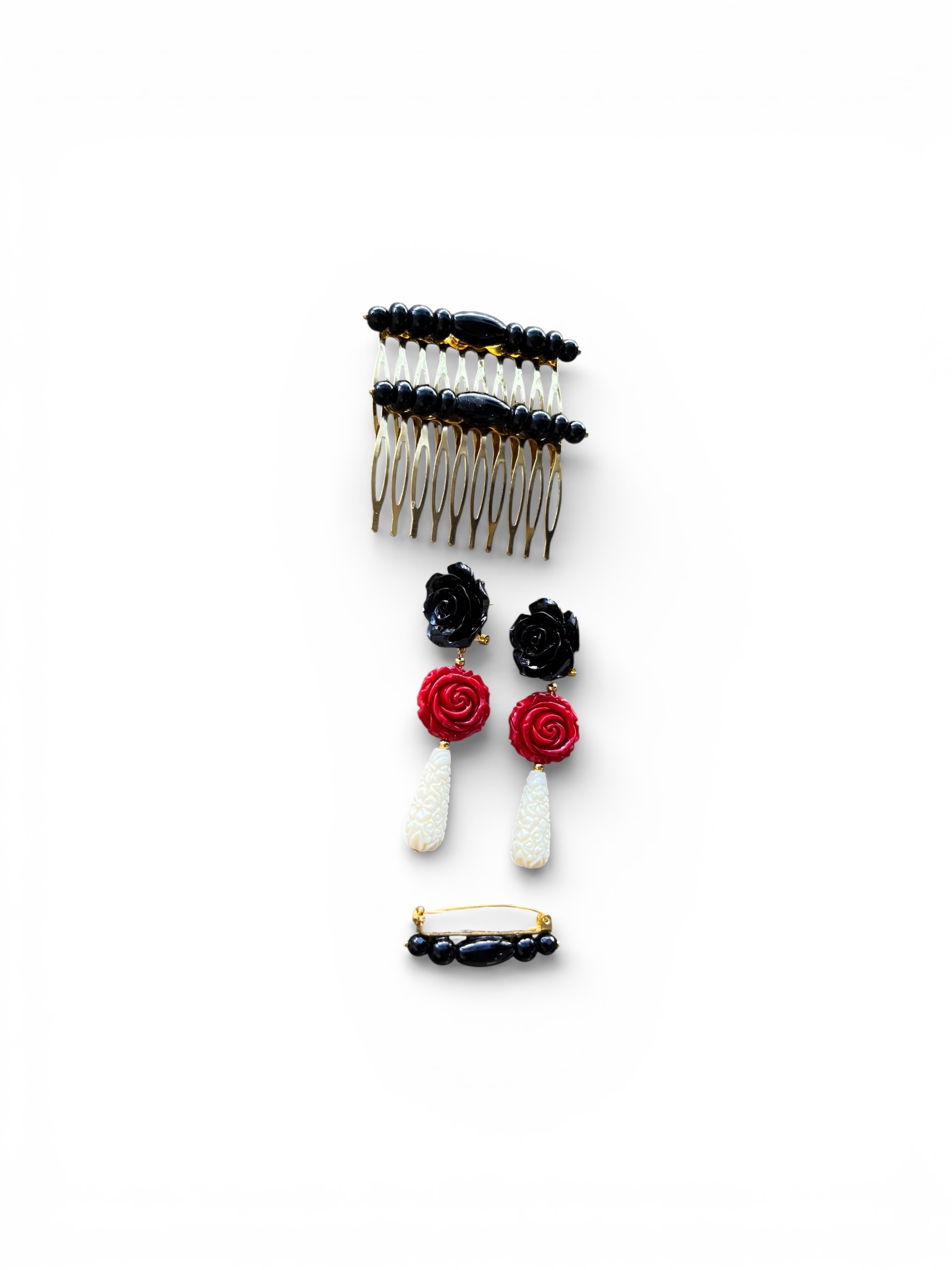 - «Un despliegue de color y sentimiento»: Los pendientes con sus rosas de resina coral y negra, y la peina adornada con azabache, son una sinfonía cromática. Una pincelada de pasión andaluza que realza tu tez, aportando luminosidad y ese toque inconfundible de alegría flamenca, ideal para destacar tanto en el bullicio de la caseta como bajo el sol de abril.