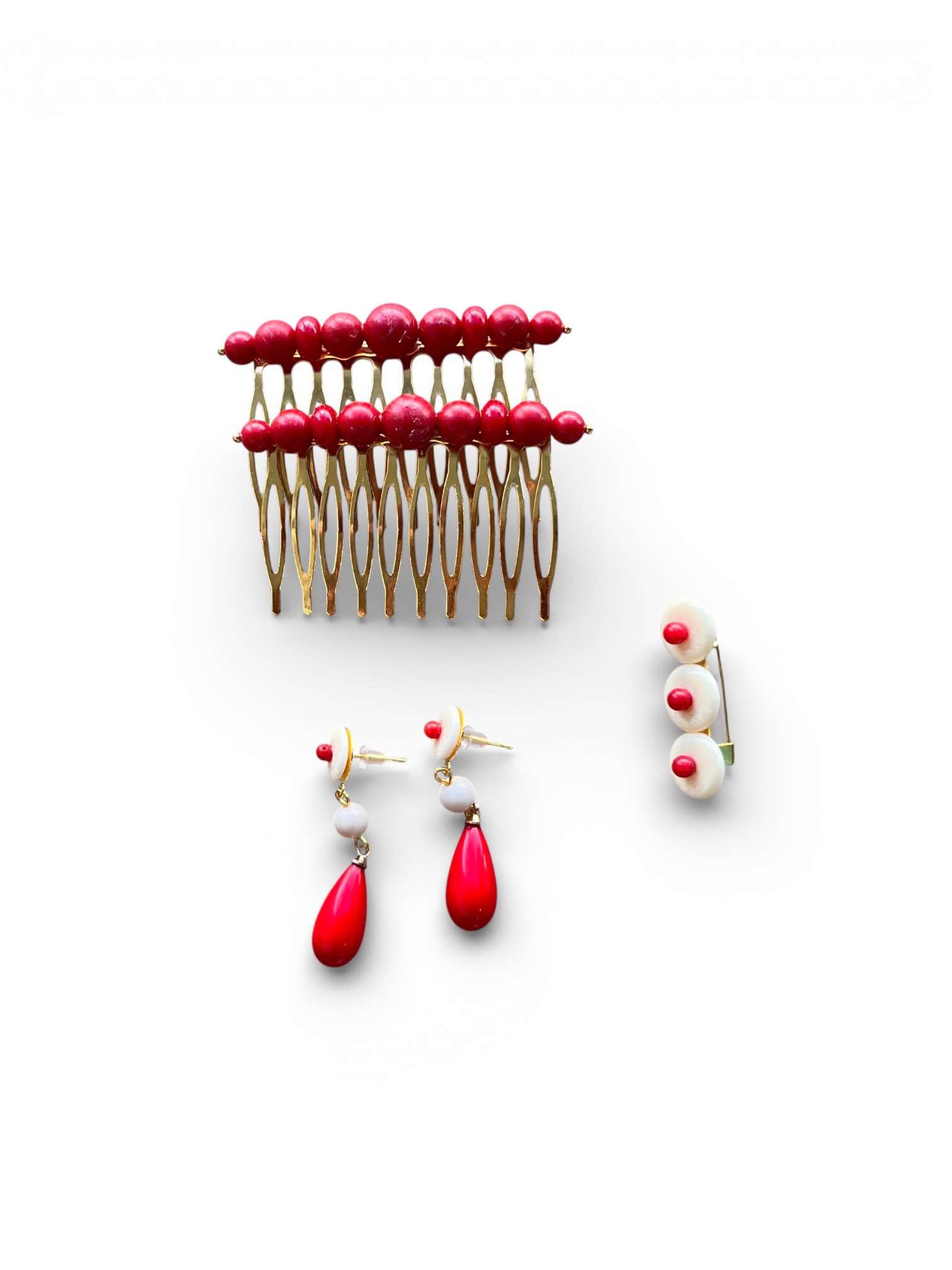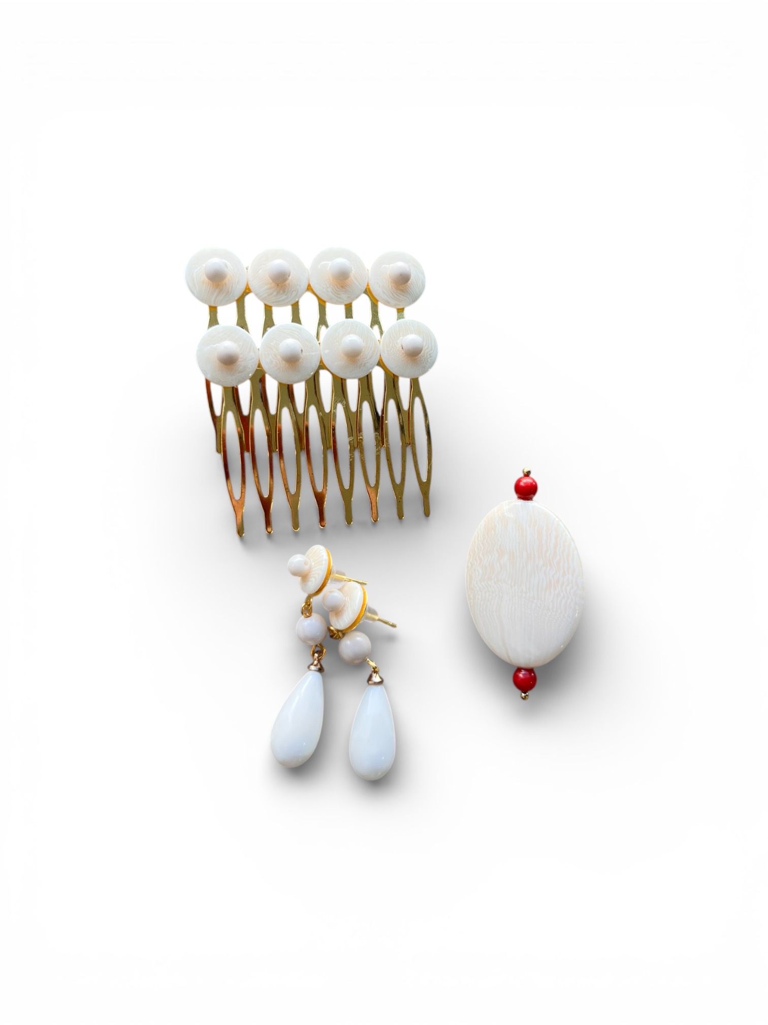 - Eleva tu traje de flamenca: La peina, de diseño horizontal y rectangular, realza tu peinado con sofisticación, mientras los pendientes de lágrima, con su base circular y gota coral, enmarcan tu rostro con distinción y movimiento. El broche, versátil y elegante, añade un toque final inconfundible a tu mantoncillo o escote, realzando cada detalle de tu atuendo, ya sea un traje de flamenca imponente o un look más casual de blusa y falda larga para un día de camino.