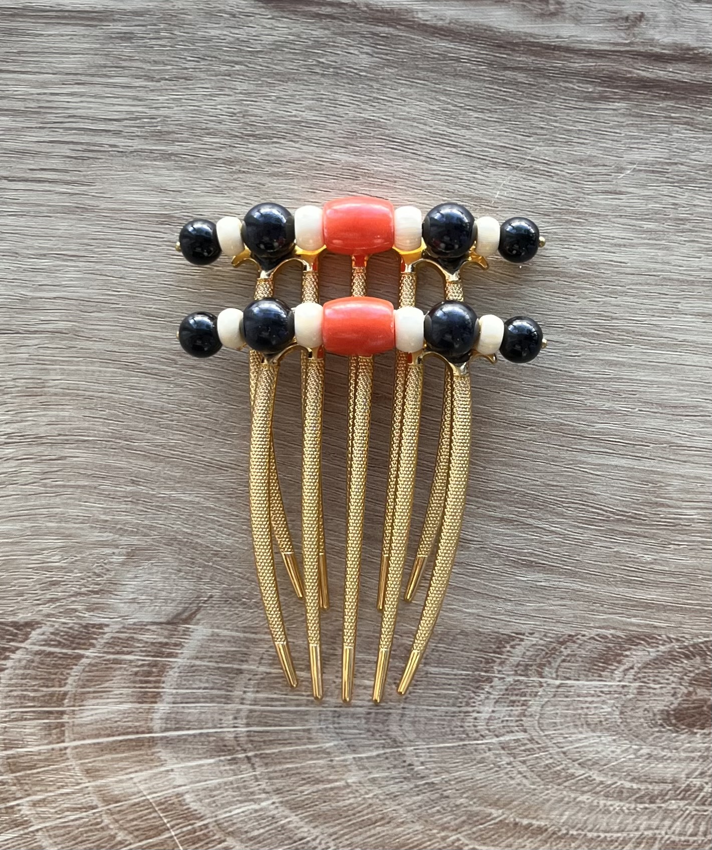 Su diseño combina cuentas en tono coral y negro, una combinación clásica y muy favorecedora que aporta fuerza, contraste y elegancia al conjunto.
