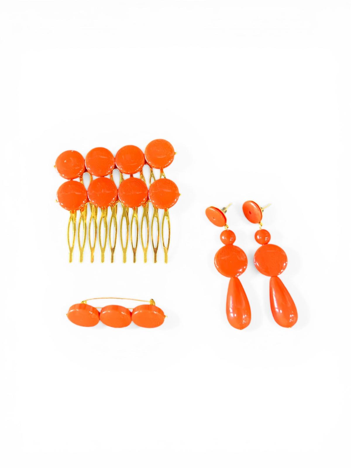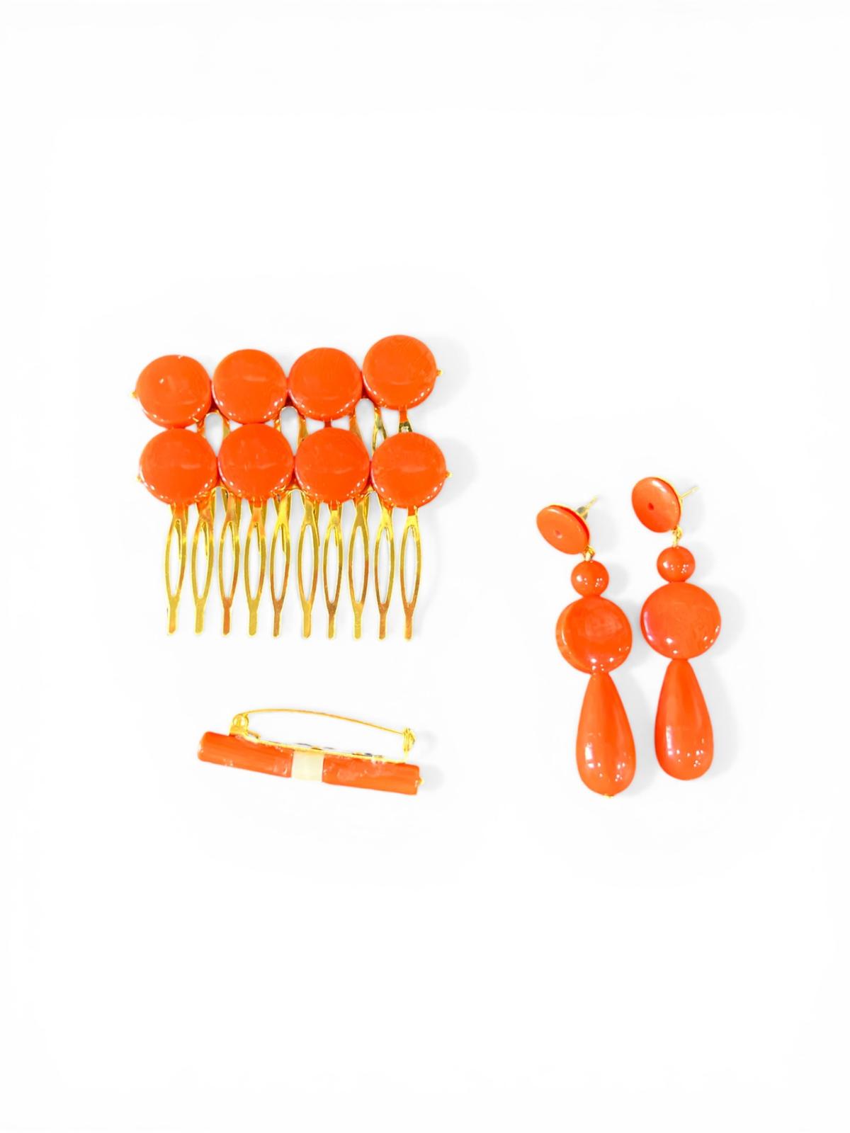 El Conjunto Coral Éter es la máxima expresión de la elegancia artesanal para la mujer que busca exclusividad en sus accesorios. Este set de tres piezas (peina de 10 púas, pendientes articulados y broche a juego) destaca por su acabado en coral pulido y oro mate, ideal para ferias, romerías y eventos de gala.