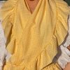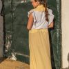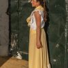 La Falda del Camino: Confeccionada en un refrescante cuadro vichy amarillo y blanco, esta falda es pura luz. Su corte amplio y fresco la convierte en la opción ideal para las largas jornadas de romería, permitiéndote moverte y bailar con total libertad. El volante inferior está rematado con una preciosa blonda calada blanca, aportando un toque de delicadeza y feminidad.