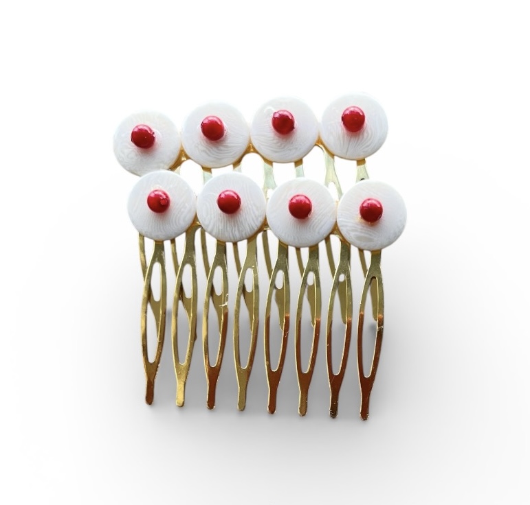 Cada pieza ha sido concebida para abrazar tu espíritu flamenco, para narrar una historia de gracia y autenticidad. Desde la peina que eleva tu mirada con destellos perlados, hasta los pendientes en forma de racimo que danzan sutilmente, emulando la frondosidad de una viña al atardecer en Triana, cada detalle te invita a vivir la feria con plenitud. El broche, discreto y a la vez lleno de carácter, completa una armonía visual que te convertirá en la protagonista silenciosa de los momentos más especiales bajo la sombra de las casetas y al ritmo contagioso de las palmas.