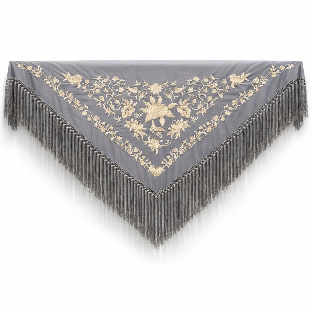 Descubre nuestro Mantón Sevilla gris bordado en beige, confeccionado en base de algodón y bordado en hilo de seda. Una pieza elegante, sobria y sofisticada, perfecta para quienes buscan un mantón de flamenca en tonos neutros y refinados.