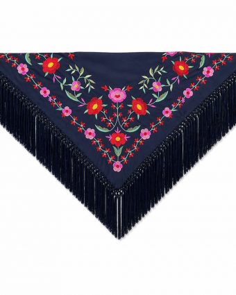 Sentirás cómo el tejido, delicado y con el peso justo, se desliza sobre tus hombros, acariciando la piel. Sus flecos, danzarines y suaves, se mecerán al ritmo de tus pasos, creando una melodía visual en las calles de albero. Es el compañero perfecto para ese momento en el que el sol empieza a despedirse y las luces de la caseta te invitan a bailar. Este no es solo un complemento; es una declaración de intenciones, un pedacito de la tradición más pura de Sevilla que te acompaña, inyectando seguridad y un toque de misterio en cada encuentro. Imagina el contraste de su azul profundo, casi un lienzo de atardecer, donde los bordados de rojos y fucsias estallan en una fiesta de color bajo el cielo de la Giralda. Es la promesa de una Feria inolvidable, con el olor a azahar y el sonido de las palmas de fondo.
