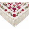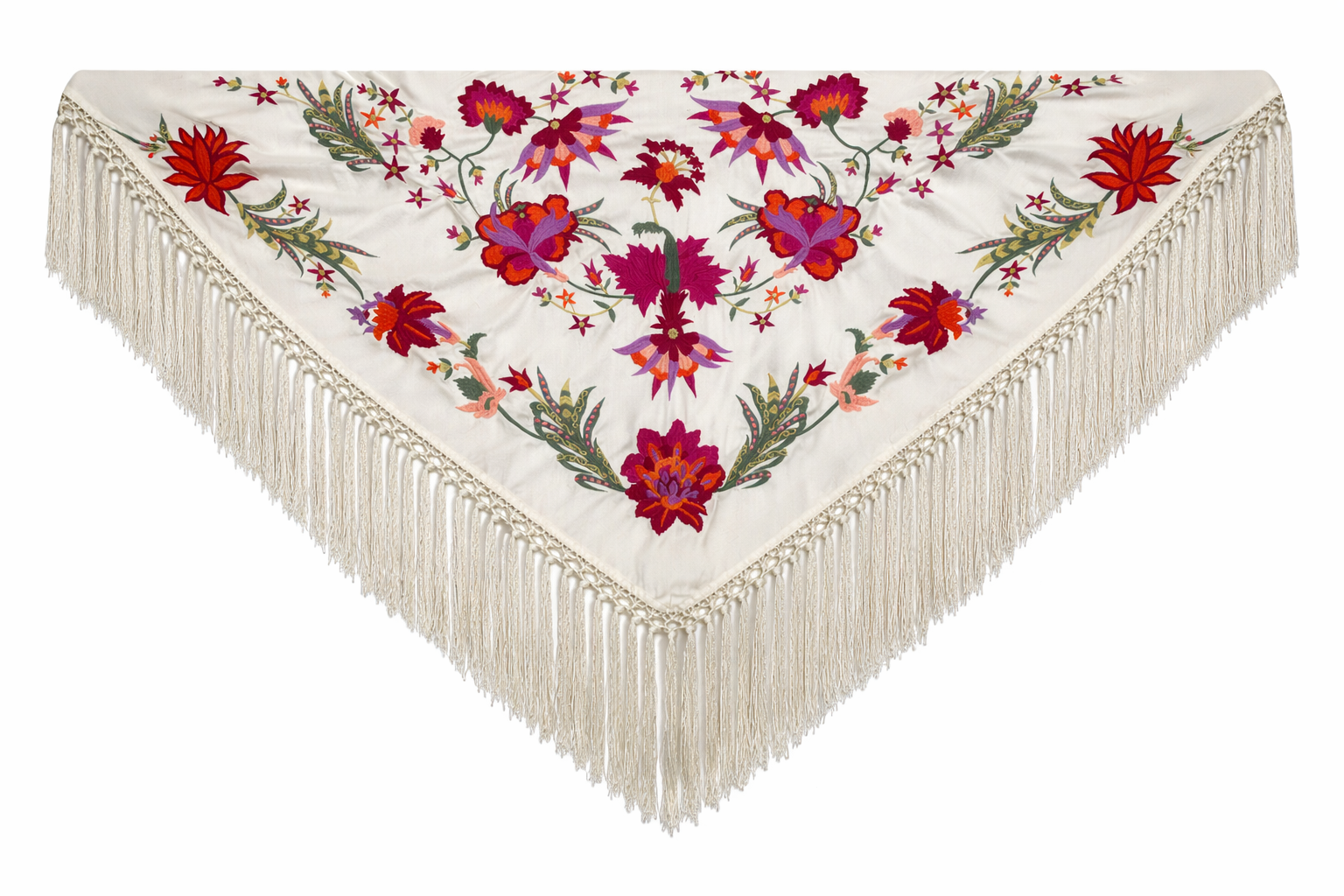 Mantón bordado en seda 100%, con bordado floral en hilo de seda y fleco borlón anudado a mano, ideal para traje de flamenca, feria, romerías, eventos y looks de invitada.