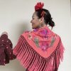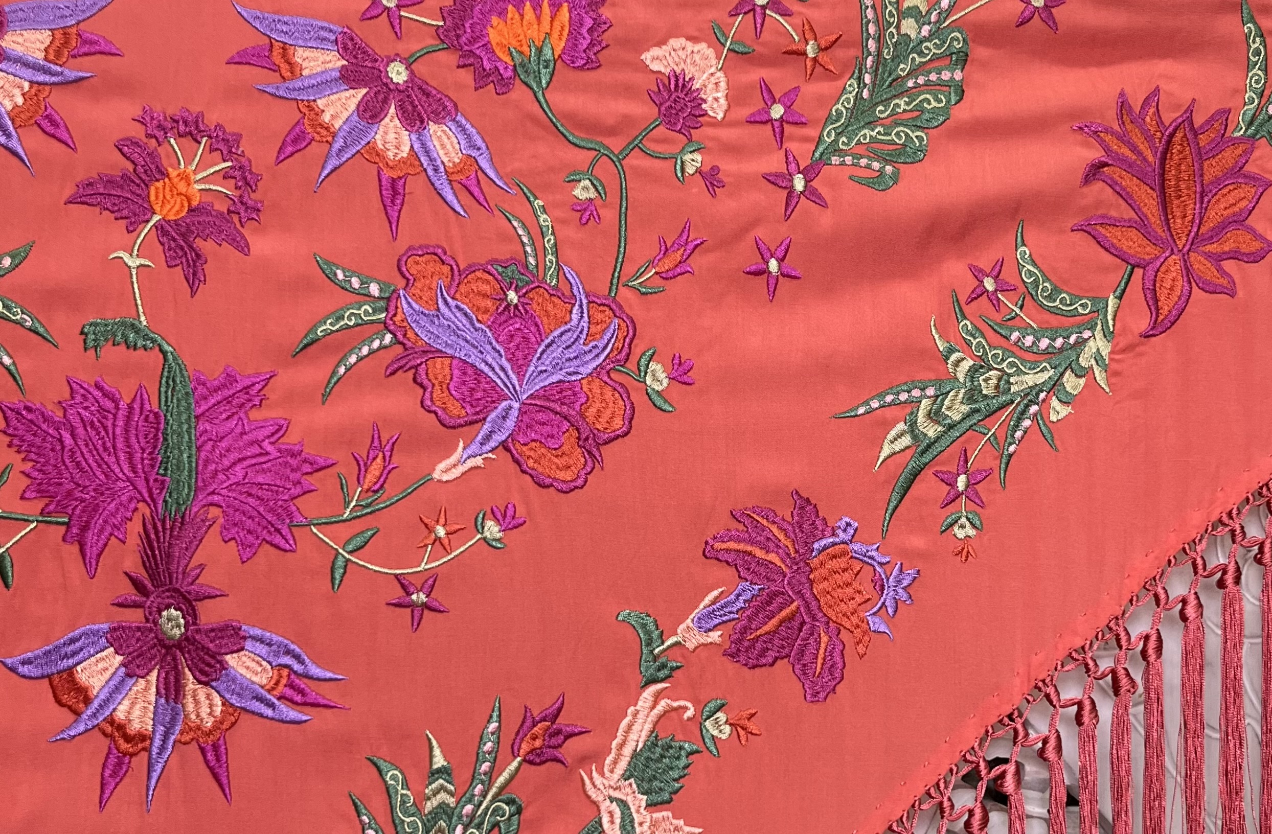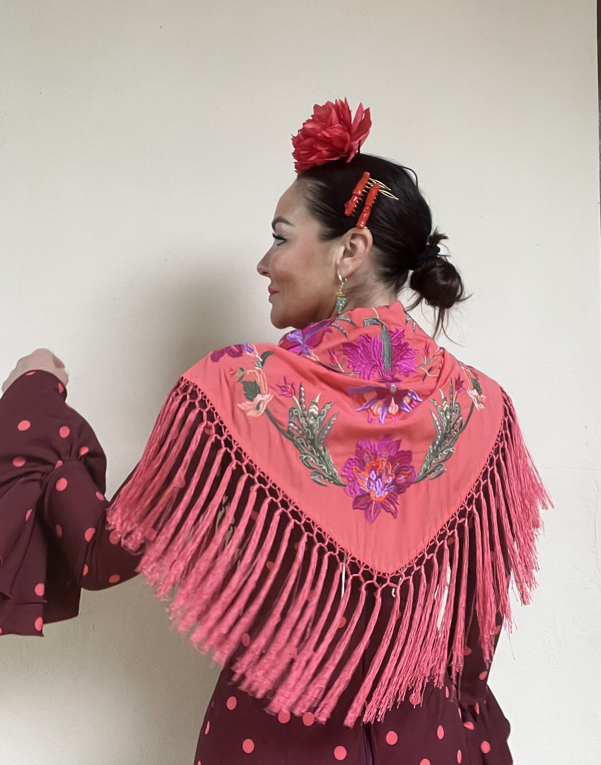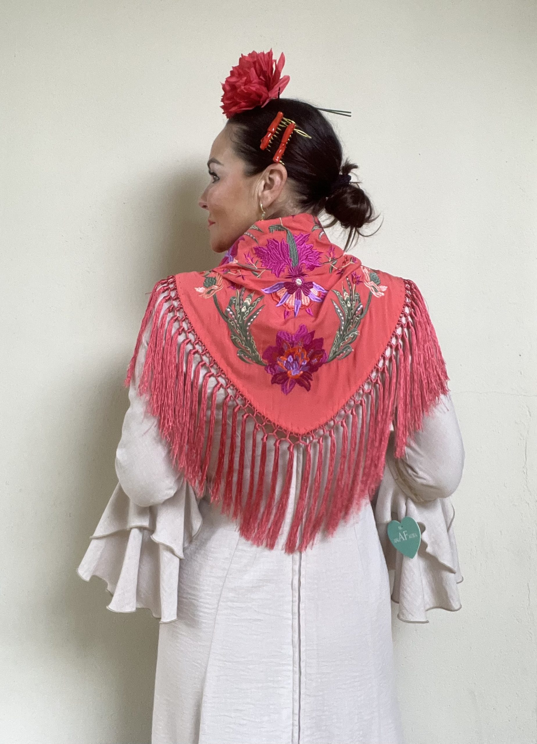 Mantón bordado en seda 100%, con bordado floral en hilo de seda y fleco borlón anudado a mano, ideal para traje de flamenca, feria, romerías, eventos y looks de invitada.