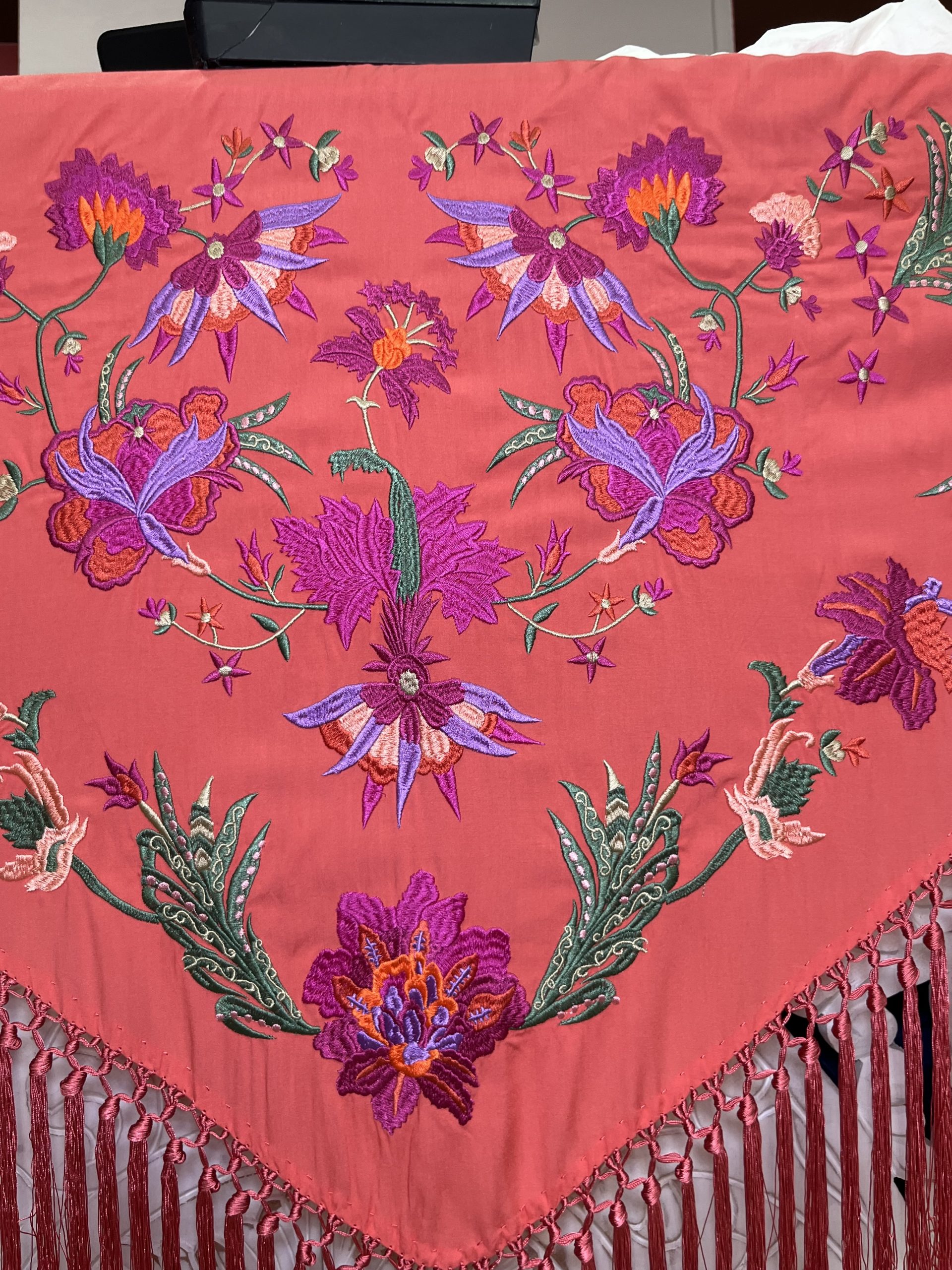 Este mantón bordado de seda destaca por su confección artesanal y su diseño elegante y atemporal. El bordado floral aporta relieve y sofisticación, mientras que el fleco borlón de seda ofrece un acabado tradicional, con buena caída y movimiento equilibrado.
