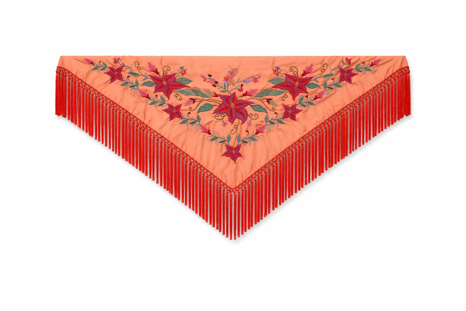 Este mantón de seda color mandarina bordado destaca por su espectacular diseño floral inspirado en la flor imperial. Las flores en tono rojo intenso se combinan con hojas en verdes y pequeños matices delicados, creando un contraste vibrante y sofisticado sobre el fondo mandarina.