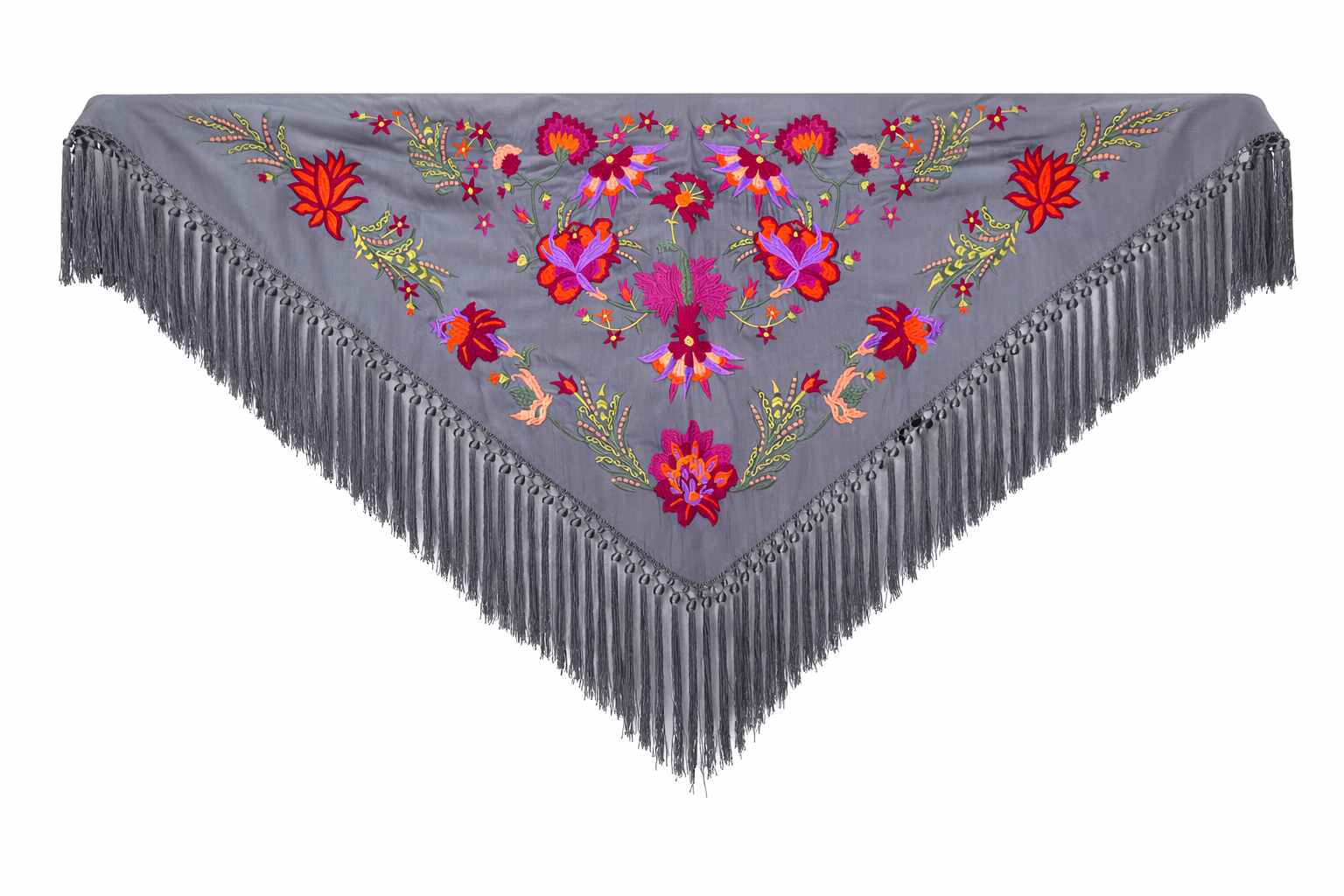 Mantón bordado en seda 100%, con bordado floral en hilo de seda y fleco borlón anudado a mano, ideal para traje de flamenca, feria, romerías, eventos y looks de invitada.