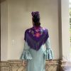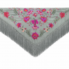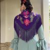 Este mantón bordado de seda destaca por su confección artesanal y su diseño elegante y atemporal. El bordado floral aporta relieve y sofisticación, mientras que el fleco borlón de seda ofrece un acabado tradicional, con buena caída y movimiento equilibrado.