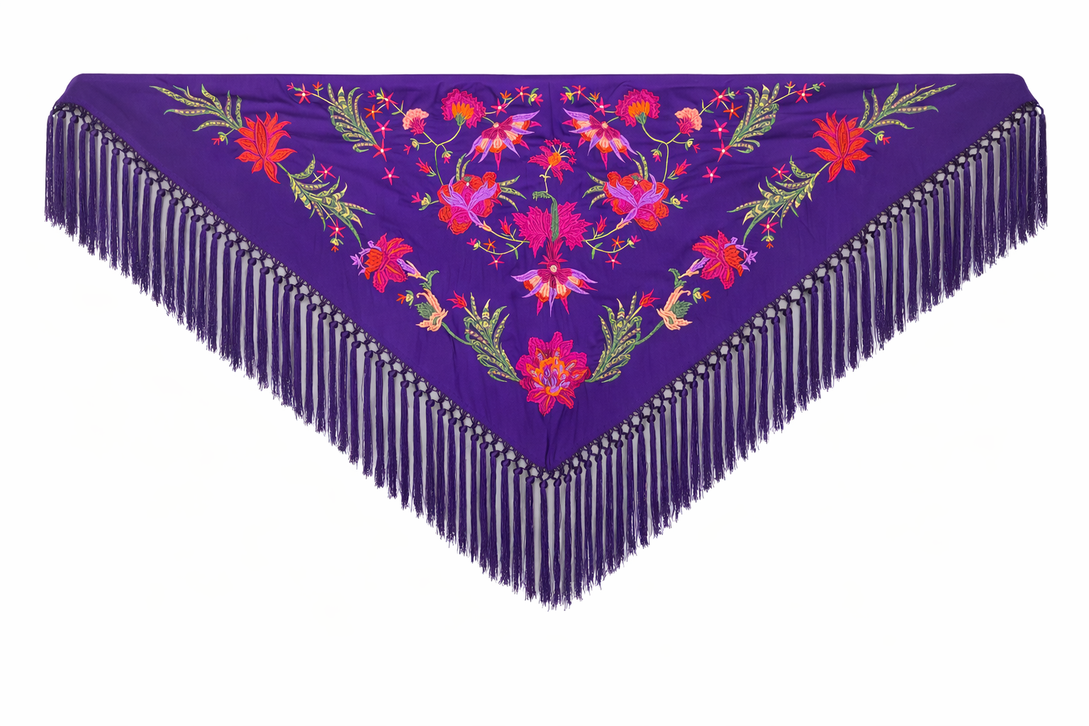 Mantón bordado en seda 100%, con bordado floral en hilo de seda y fleco borlón anudado a mano, ideal para traje de flamenca, feria, romerías, eventos y looks de invitada.