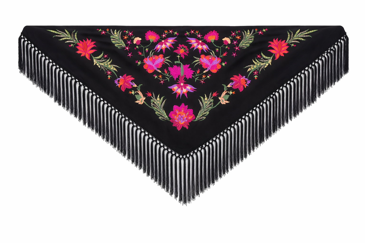 Mantón bordado en seda 100%, con bordado floral en hilo de seda y fleco borlón anudado a mano, ideal para traje de flamenca, feria, romerías, eventos y looks de invitada.