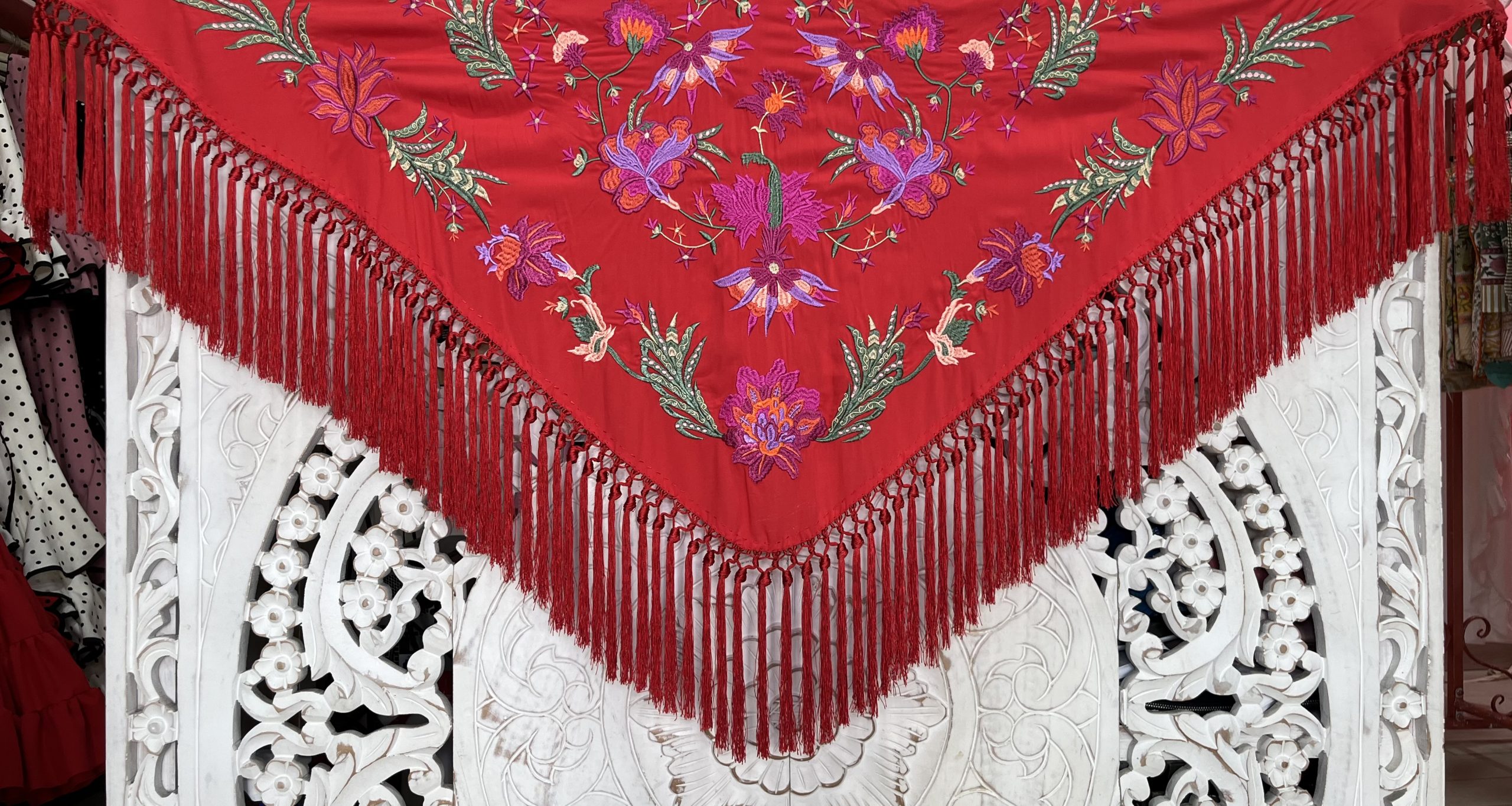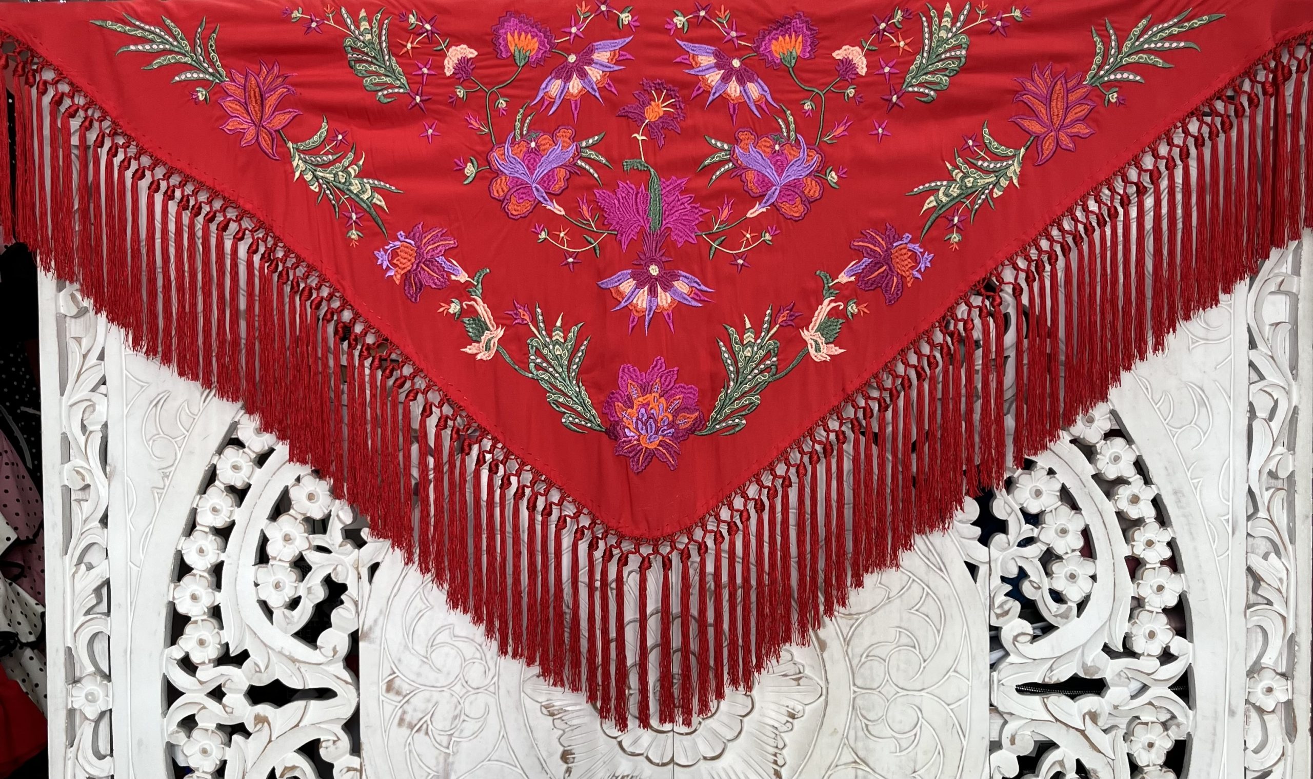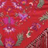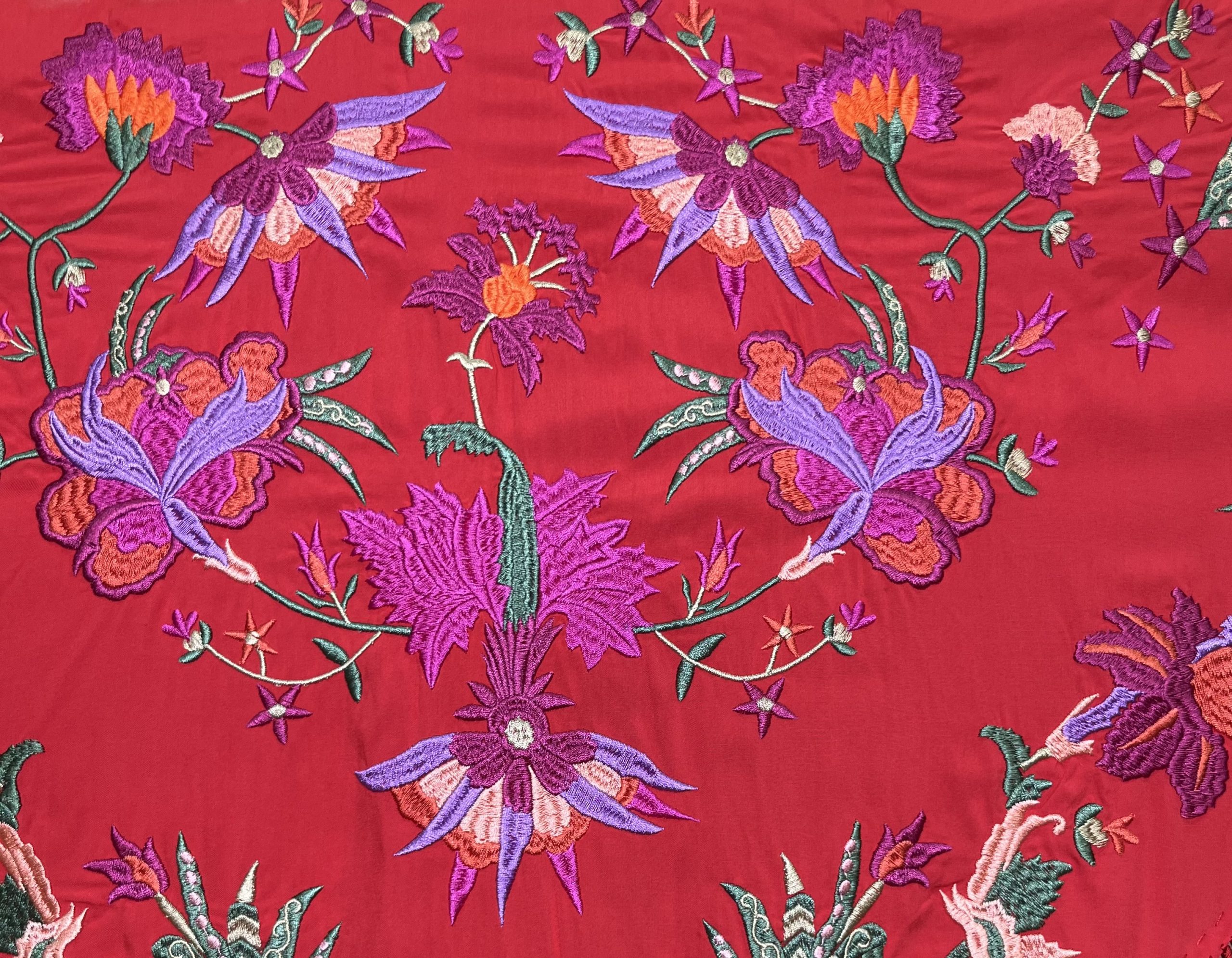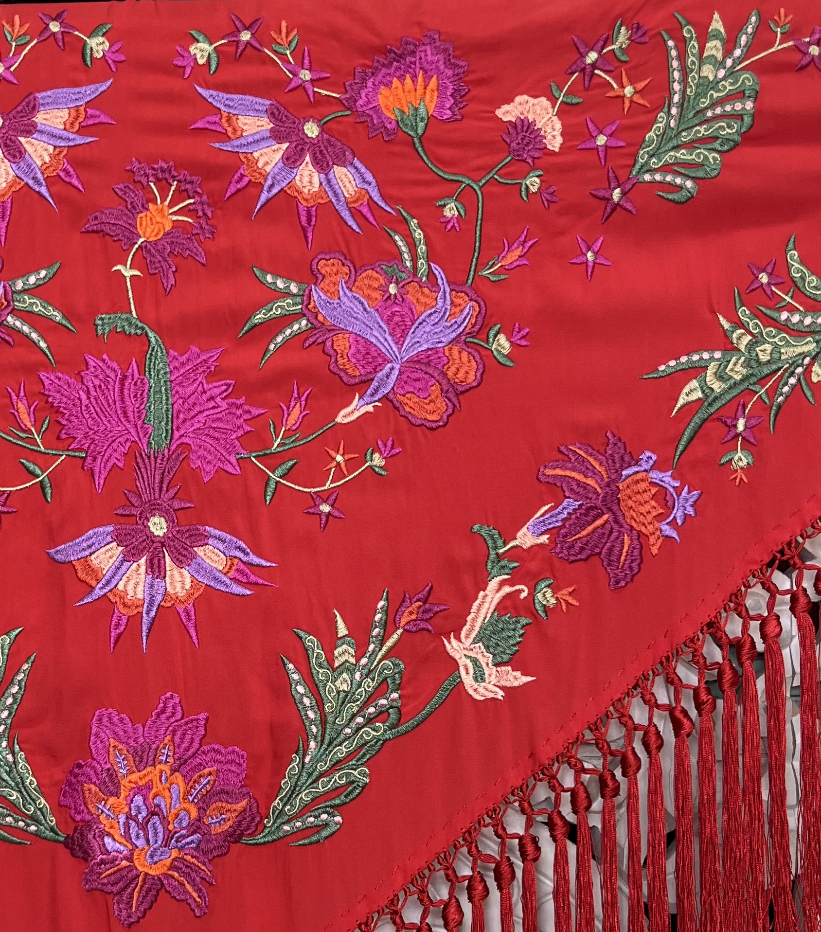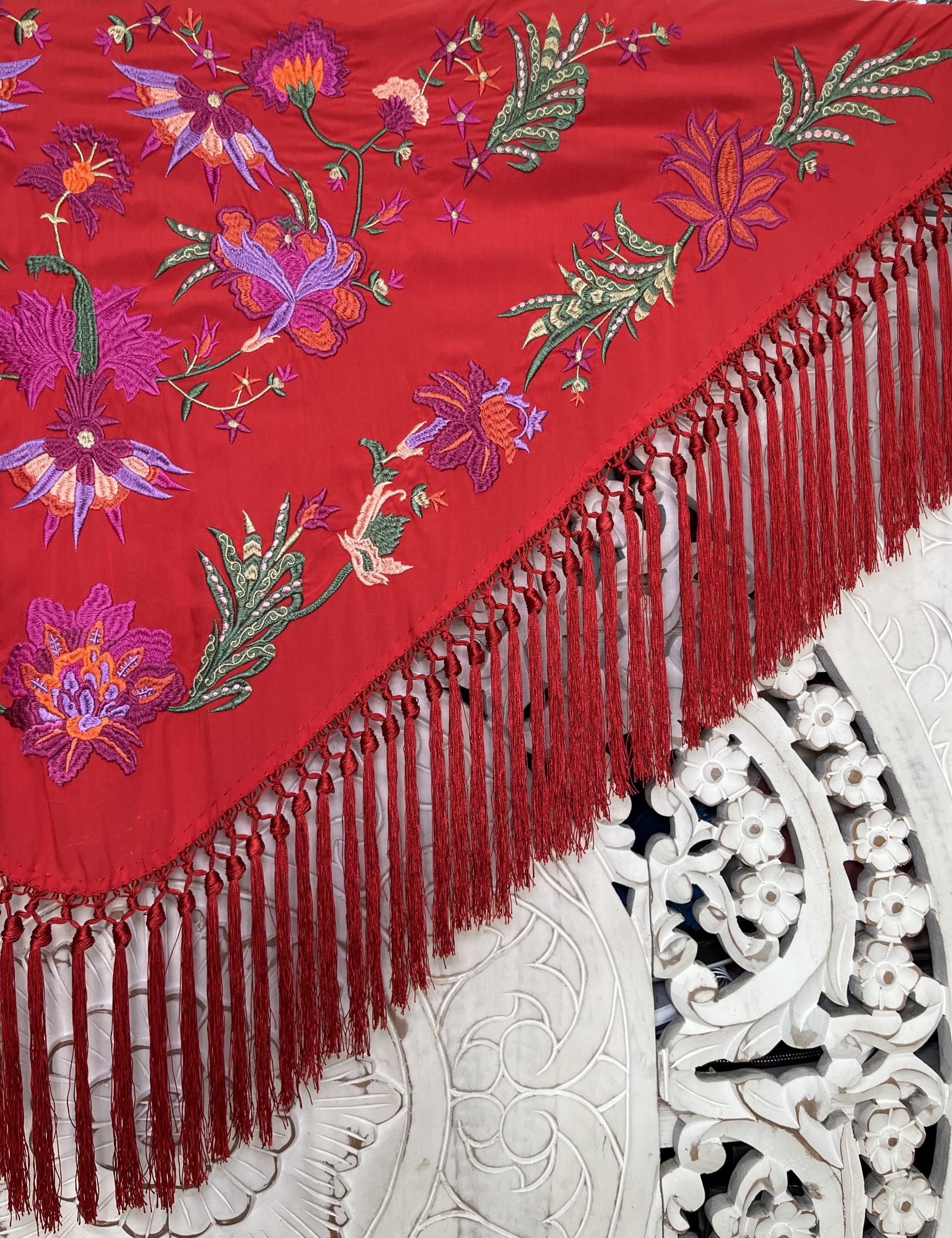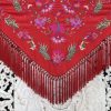 Mantón bordado en seda 100%, con bordado floral en hilo de seda y fleco borlón anudado a mano, ideal para traje de flamenca, feria, romerías, eventos y looks de invitada.
