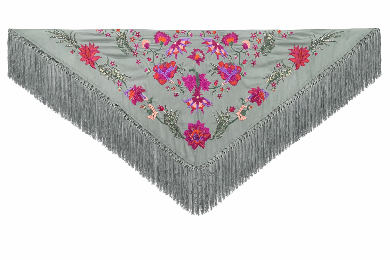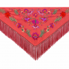 Mantón bordado en seda 100%, con bordado floral en hilo de seda y fleco borlón anudado a mano, ideal para traje de flamenca, feria, romerías, eventos y looks de invitada.