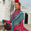 ¿Con qué colores de traje combina mejor este mantón? El audaz contraste entre el aguamarina y el rojo lo convierte en el compañero perfecto para trajes de flamenca rojos, blancos (crea un efecto muy fresco y chic), negros, verdes botella para una combinación más inesperada, o incluso buganvillas para un juego de color vibrante y atrevido. Es la pieza ideal para añadir un toque de personalidad única a tu conjunto.