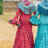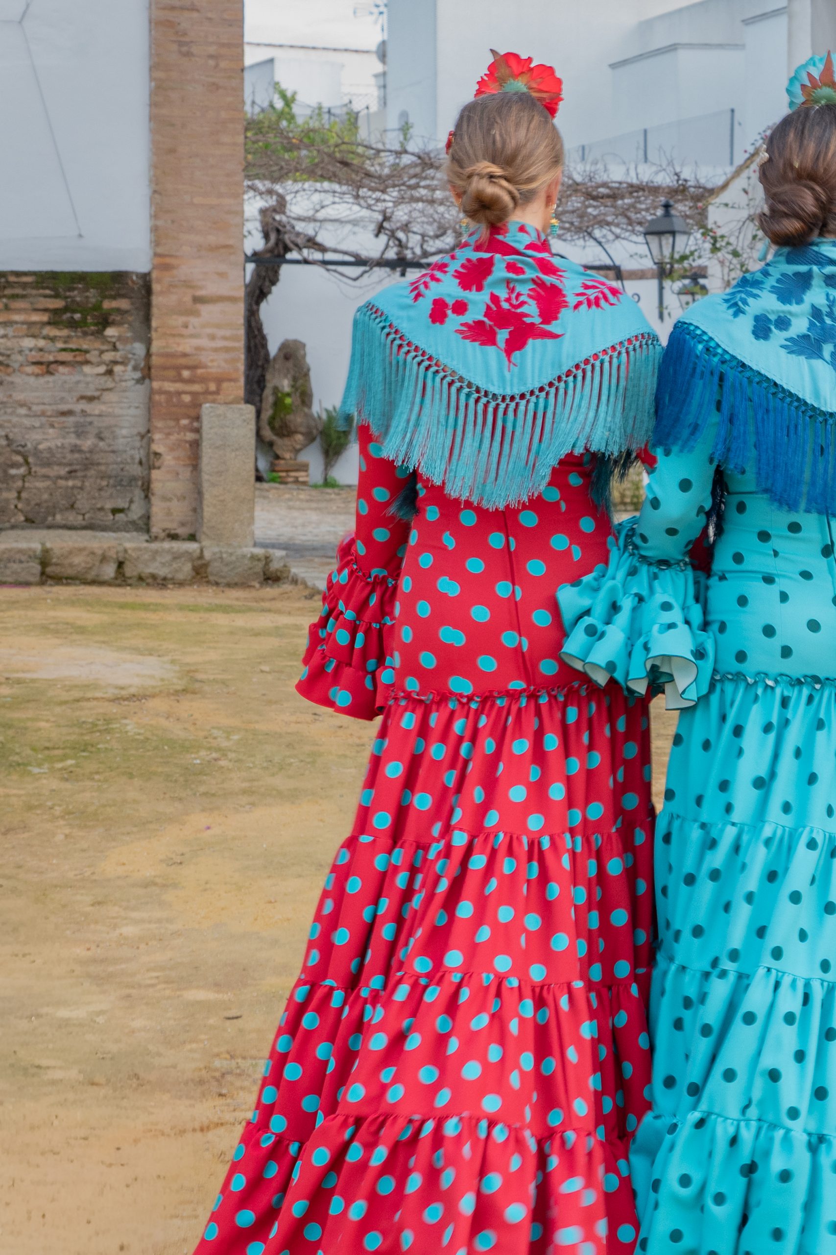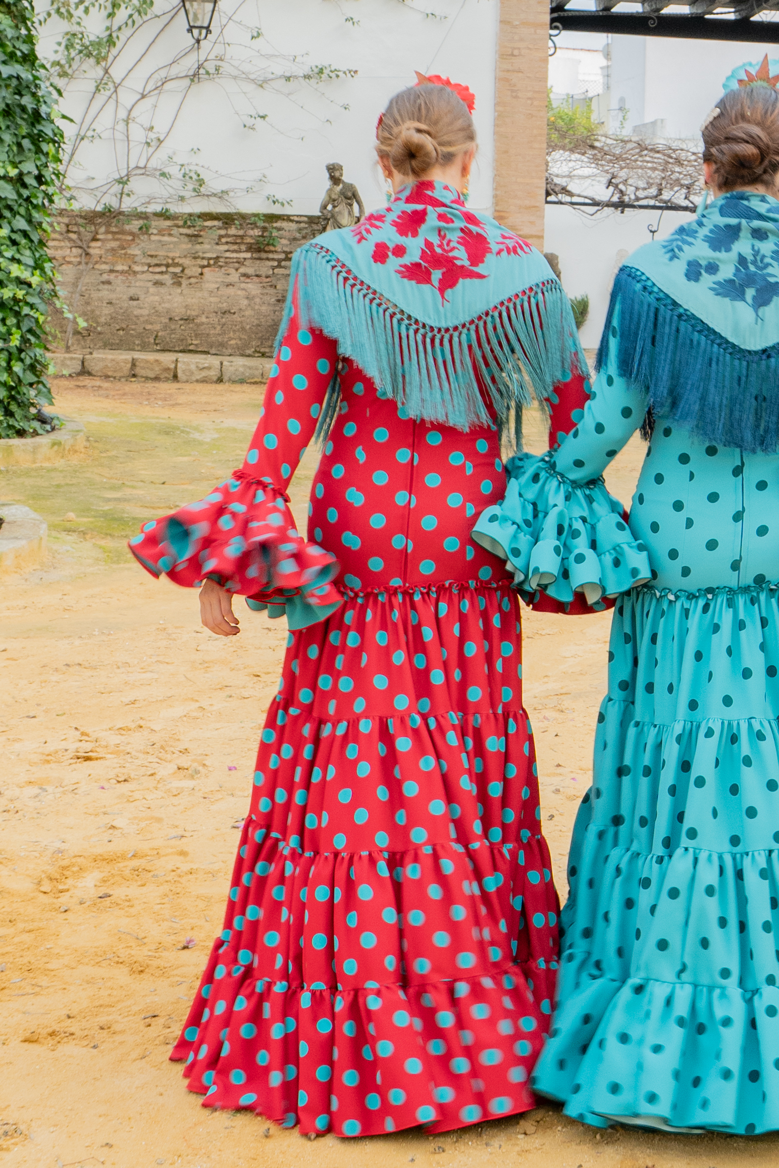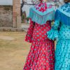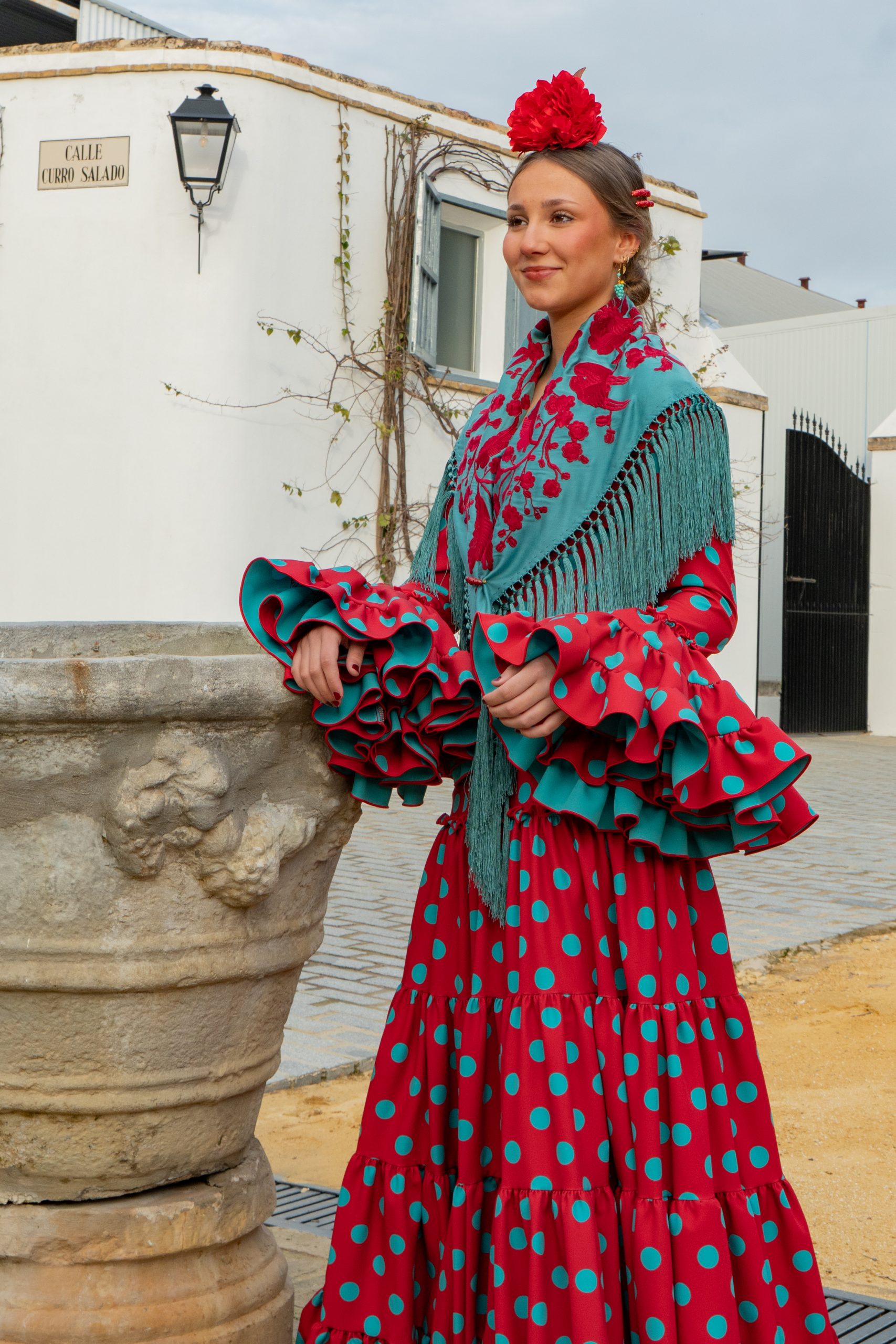 - Su vibrante combinación de aguamarina y rojo es una oda a la alegría y el color de nuestra Feria, capturando miradas y transmitiendo la auténtica alma andaluza en cada puntada.