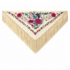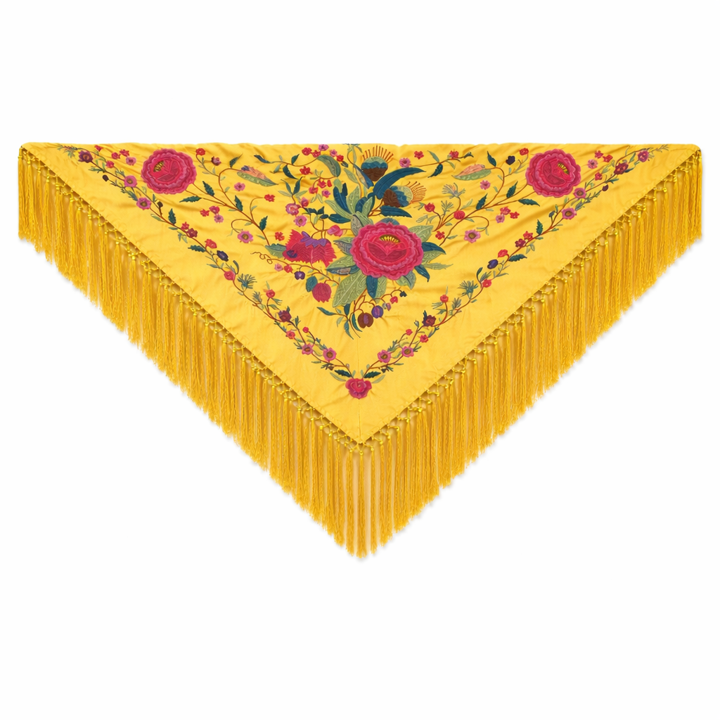 ¿Cuáles son sus medidas aproximadas y para qué altura es ideal? Este mantón tiene un ancho de 1,30 metros en su lado superior y un largo central de 65 centímetros, con flecos de 22 centímetros, lo que hace un largo total de 87 centímetros. Es un tamaño versátil que se adapta maravillosamente a la mayoría de las alturas y complexiones, realzando la figura sin resultar excesivo.