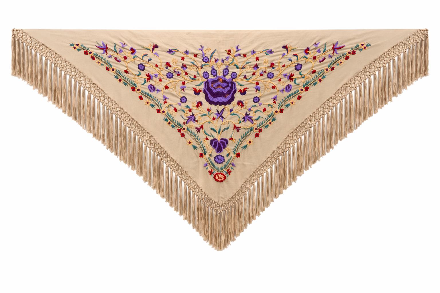 Mantón flamenco jardín de seda lila y crema para feria