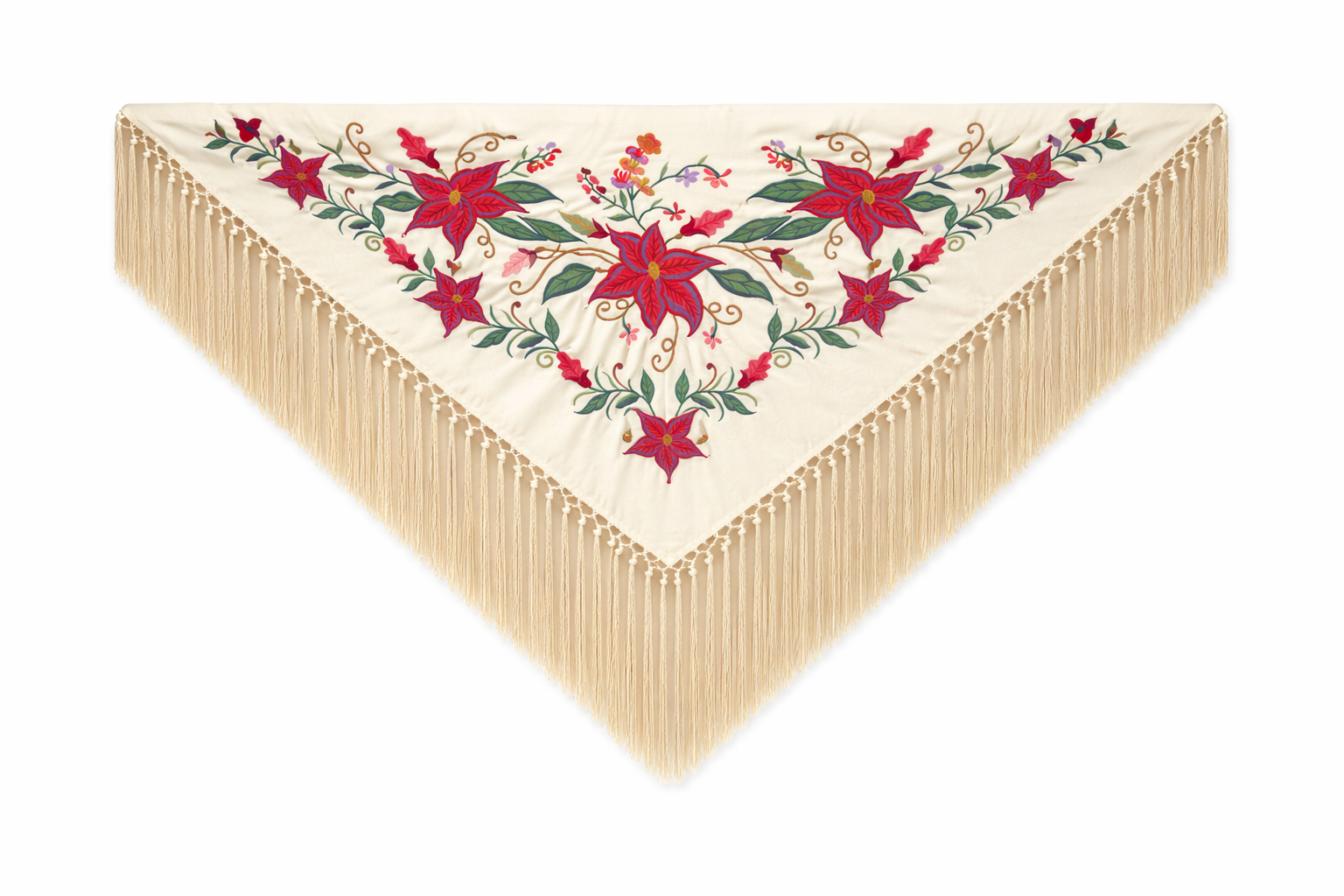 El color marfil aporta luz y elegancia, permitiendo que el bordado destaque con profundidad y armonía. El resultado es un mantón refinado, femenino y de gran presencia.
