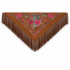 Este mantón de seda marfil bordado en seda destaca por su espectacular diseño floral inspirado en la flor imperial. Las flores en tono fucsia intenso se combinan con hojas en verdes y azules suaves, creando un contraste vibrante y sofisticado sobre el fondo marfil.