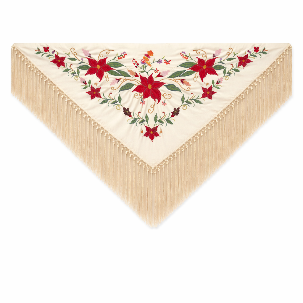 «Para que te acompañe en muchas ferias, guárdalo desplegado o enrollado con cuidado para no doblar los flecos. Para desenredarlos, cuélgalo y peina suavemente con los dedos. Se recomienda limpieza en seco especializada para mantener la seda natural y la intensidad de los colores intactos. ¡No lo mojes!»