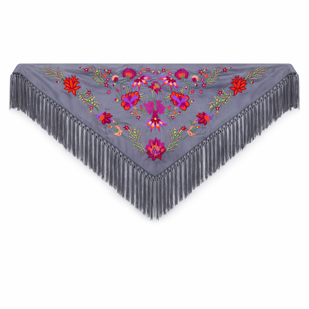 Imagina la entrada al Real, el bullicio de casetas, el olor a azahar y el rumor de palmas… Y tú, luciendo este mantón gris buganvilla que se funde con la luz del atardecer sevillano. Es esa pieza especial que no solo complementa tu traje, sino que cuenta tu historia en cada movimiento, en cada roce de sus flecos al compás de una sevillana.