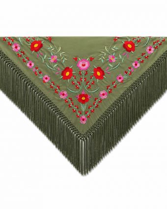 - Un diseño propio que florece: Nuestros exclusivos motivos florales, con flores rojas y coral sobre el fresco verde agua, están pensados para capturar la esencia de la primavera andaluza. Un lujo para tus sentidos y para tu vista, donde el enrejado de los flecos, también hecho a mano, añade una maestría artesanal inigualable.