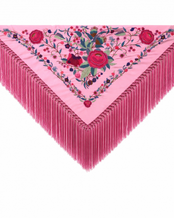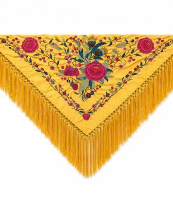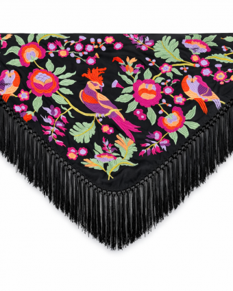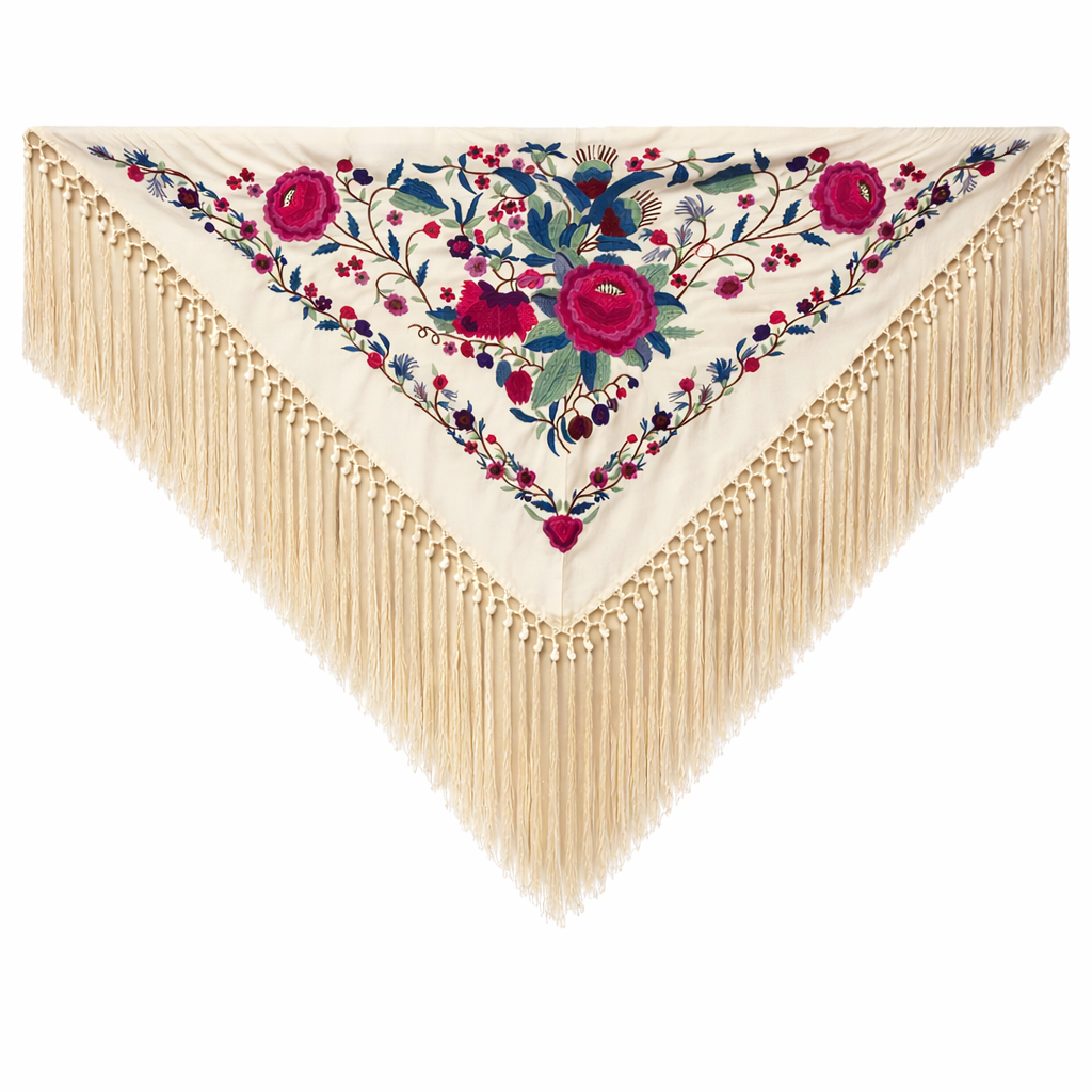 El valor diferencial de este mantón reside en su bordado floral multicolor, trabajado con precisión artesanal para lograr una combinación cromática armónica, elegante y visualmente impactante.