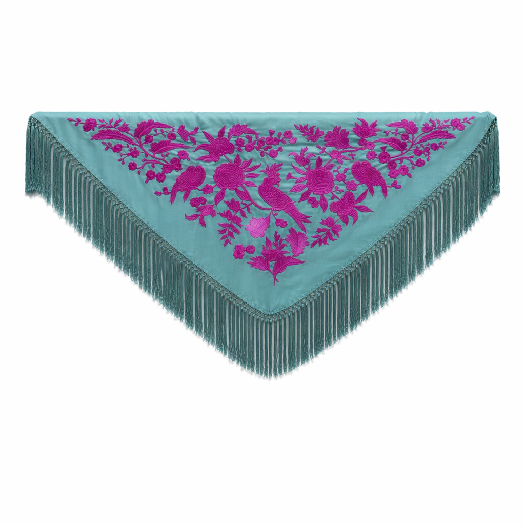 Descubre nuestro Mantón Sevilla verde agua bordado en buganvilla, confeccionado en base de algodón y bordado en hilo de seda. Una pieza fresca, elegante y con un contraste vibrante que realza cualquier traje de flamenca.