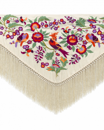 El diseño floral y de aves, trabajado con relieve y excelente definición, mantiene la esencia tradicional del mantón sevillano, aportando al mismo tiempo personalidad y carácter.