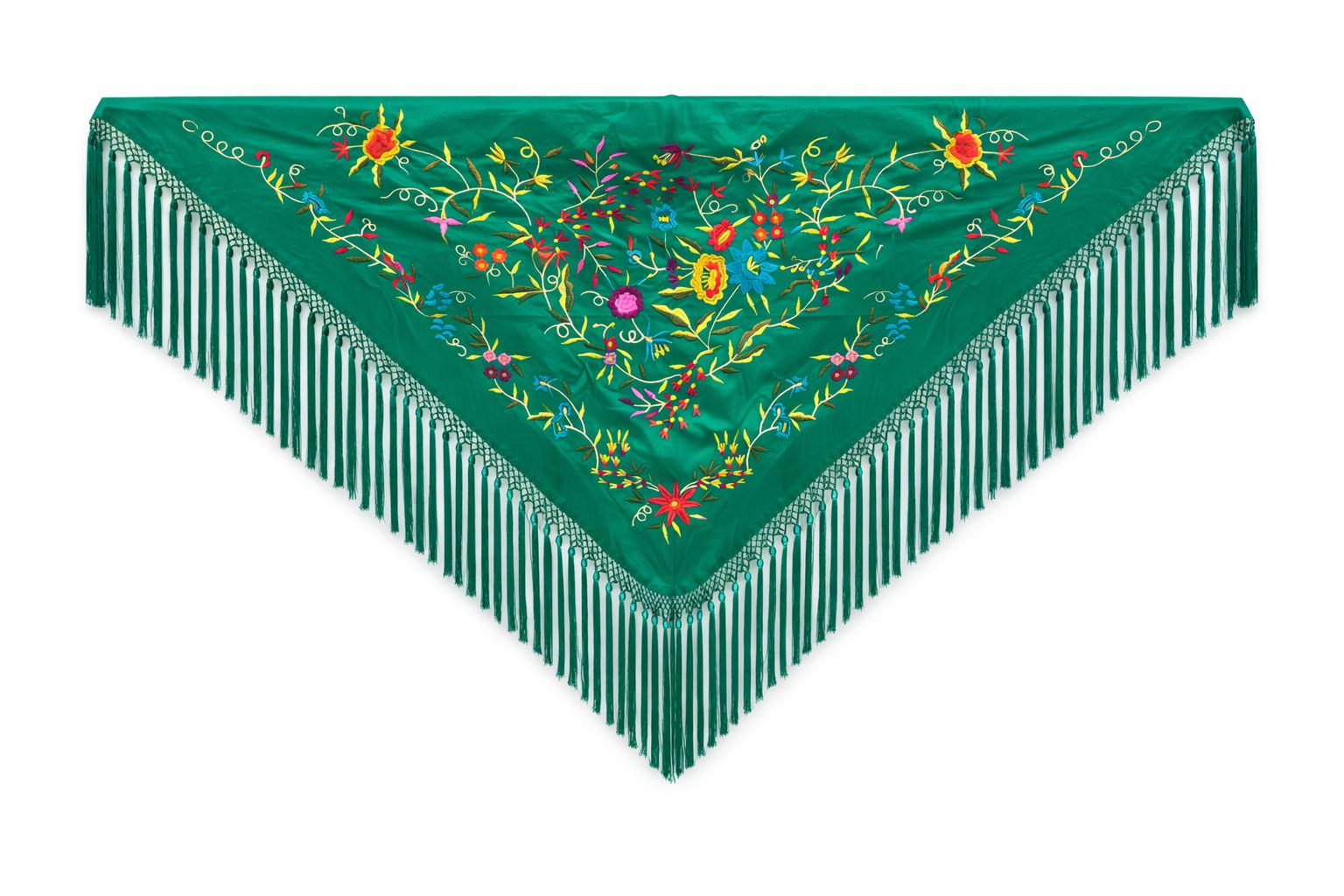 Sobre una base verde esmeralda vibrante, el diseño exclusivo de Ana Faura despliega una paleta de hilos en tonos amarillos sol, azules cian y rosas intensos. Cada motivo floral ha sido colocado para que, al lucirlo, el mantón cree un marco de luz alrededor de la flamenca, favoreciendo tanto a pieles claras como bronceadas.