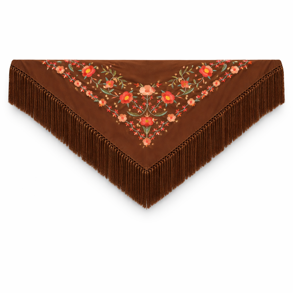 Imagínate la entrada al Real, el sol de la tarde filtrándose entre los farolillos, el murmullo de voces y el aroma a jazmín y albero. Este mantoncillo es el abrazo de la Feria, el cómplice de tus sevillanas y el detalle que transformará tu presencia en pura poesía. Su color chocolate, profundo y envolvente, es el lienzo perfecto para que los corales y verdes de sus bordados cobren vida, evocando la alegría y la gracia que solo se sienten en una Feria de Abril en Sevilla.