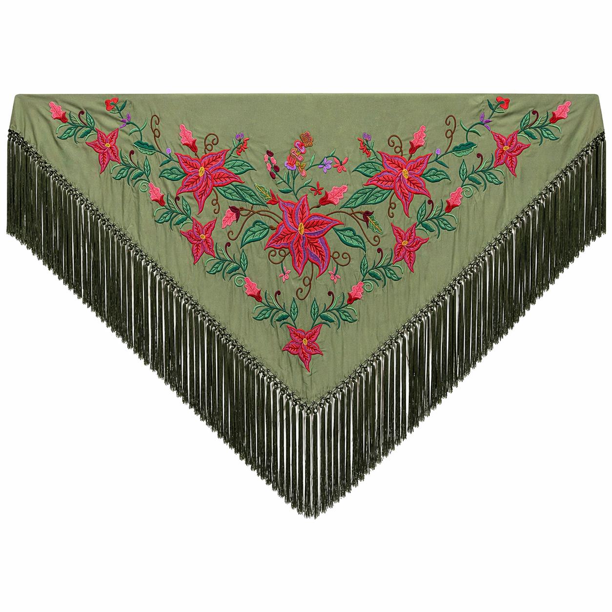 Al caer suavemente sobre tus hombros, sentirás cómo el tejido, de primera calidad, se adapta a ti con una delicadeza que te sorprenderá. Sus flecos danzarán al compás de las sevillanas, creando un aura de gracia que captura la luz del sol o el destello de los farolillos. La combinación de un profundo oliva y unos rosas intensos, salpicados de verdes y toques morados y amarillos, te envolverá en una sensación de arraigo a la tierra y, a la vez, de una frescura renovada. Este mantoncillo es el susurro de la tradición en cada volanta, el eco de palmas lejanas en cada giro.